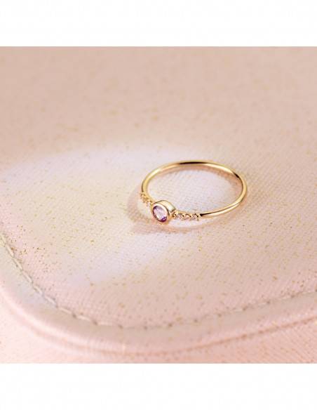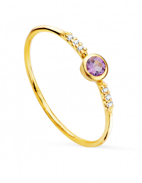 18K SORTIJA ORO AMARILLO 6 DIAMANTES 0.030 QTS. G-VS2. AMATISTA 3 MM