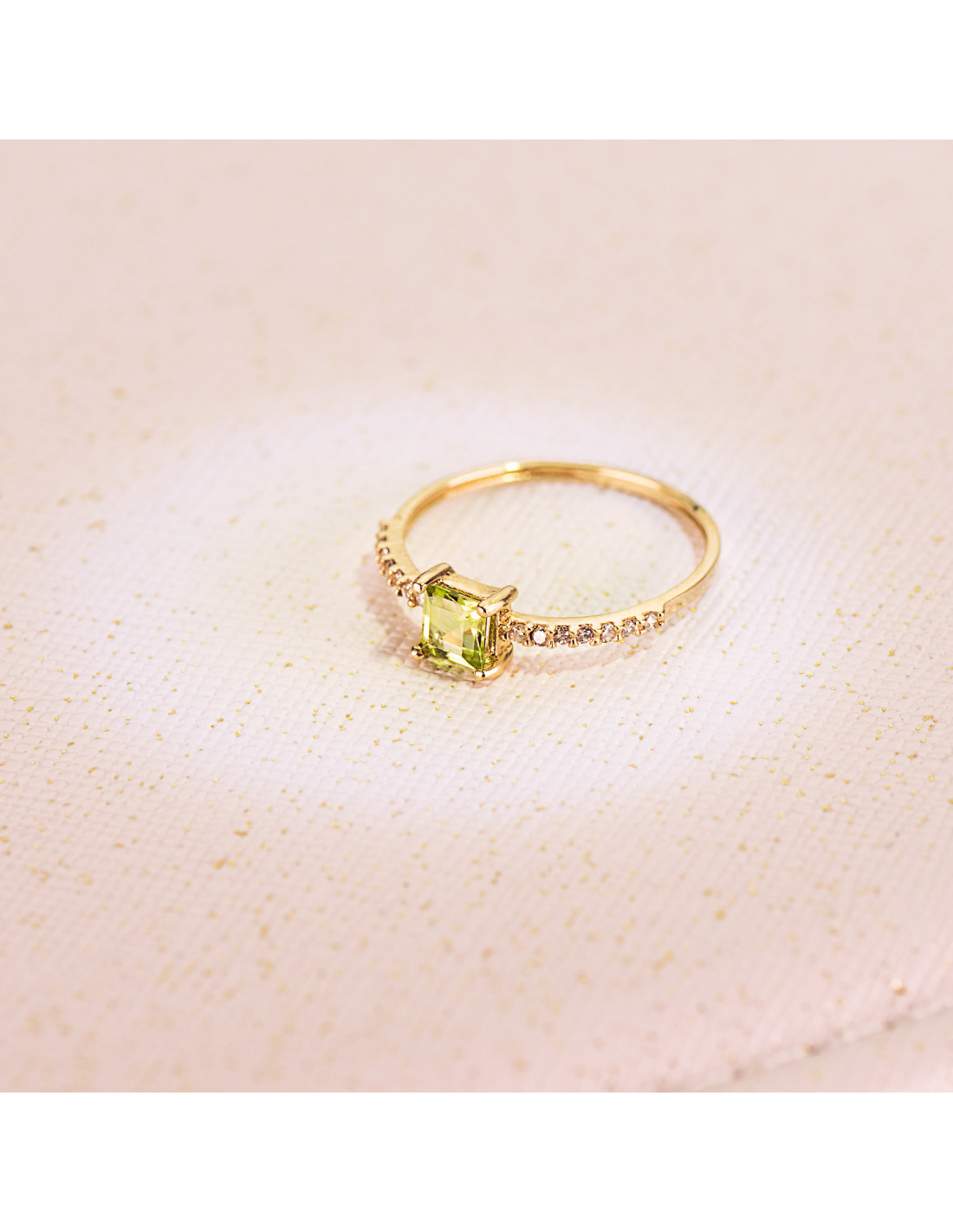 SORTIJA ORO AMARILLO 14 DIAMANTES 0.070 QTS. G-VS2. OLIVINA 4X4 MM CUERPO 1 MM
