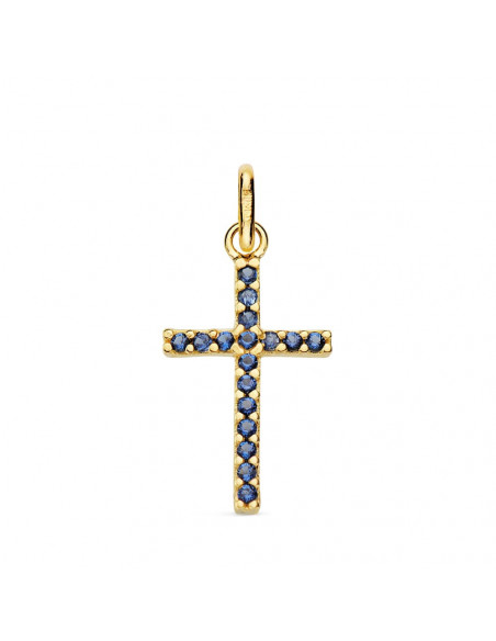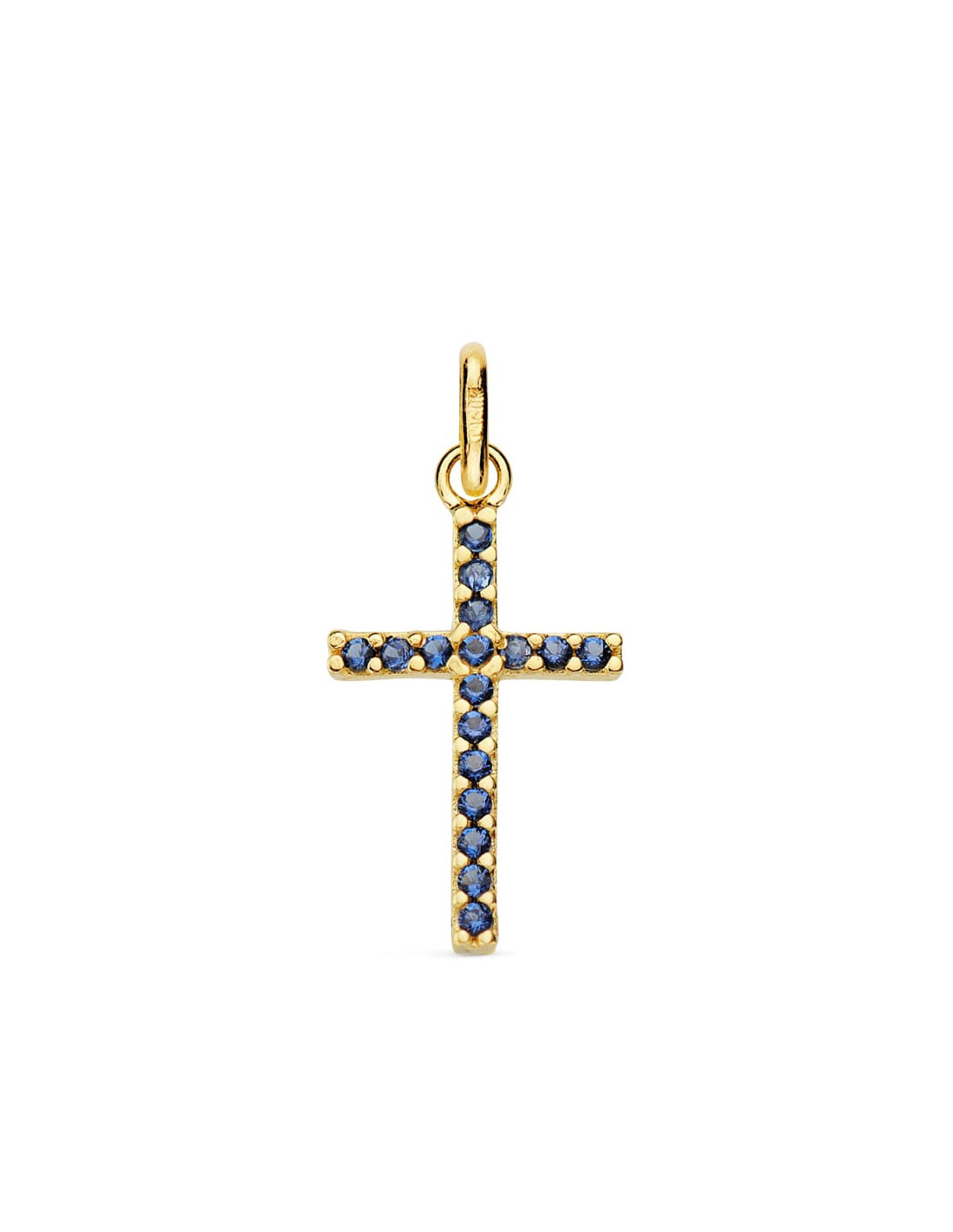 18K CRUZ ORO AMARILLO PIEDRAS AZULES 16X10 MM