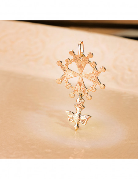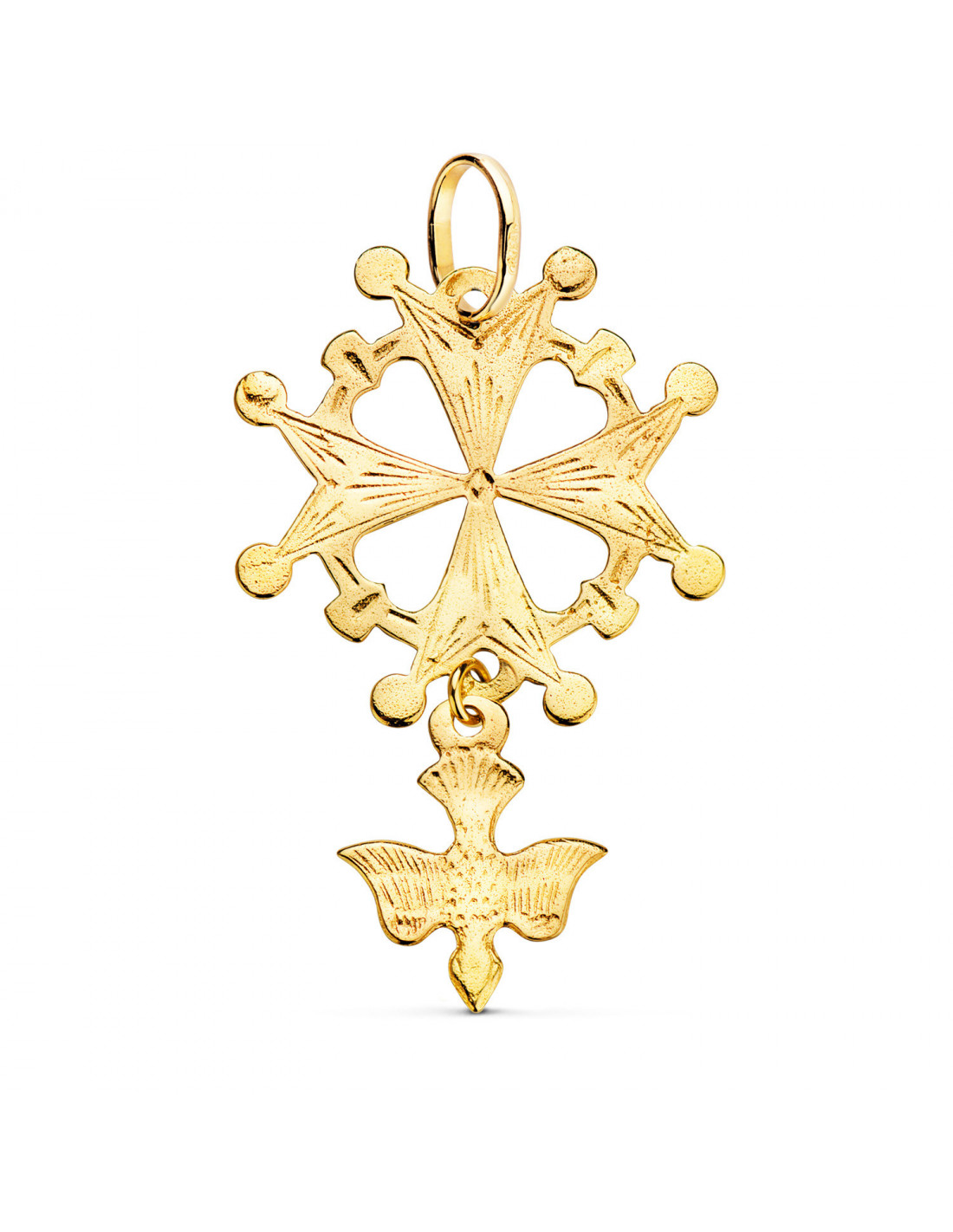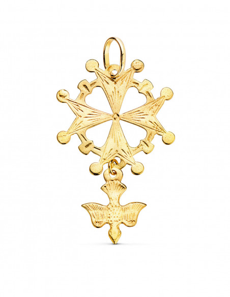18K CRUZ DE HUGUENOTTE ORO AMARILLO CON PALOMA. 40 X 25 MM