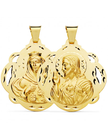 18K ESCAPULARIO VIRGEN DEL CARMEN+CORAZON DE JESUS PANDERETA CALADA 42 MM