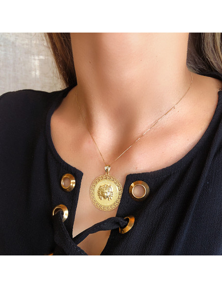 18K MEDALLA ORO AMARILLO MEDUSA CON BORDE CALADA Y GRECA MATIZADA 33 MM