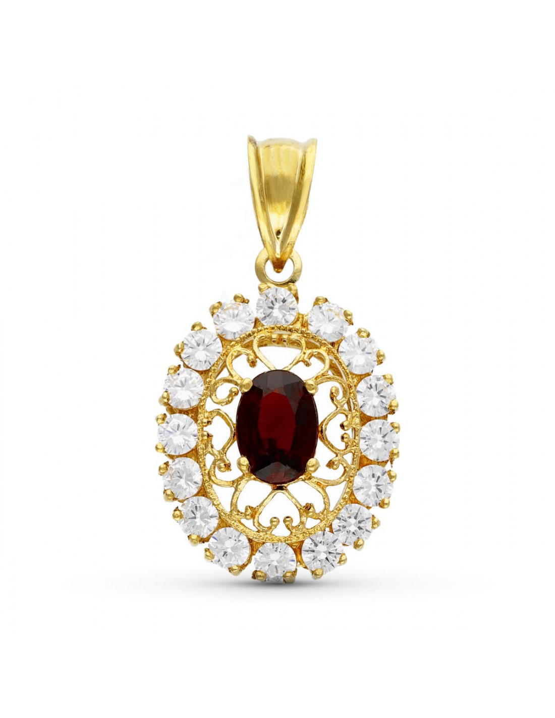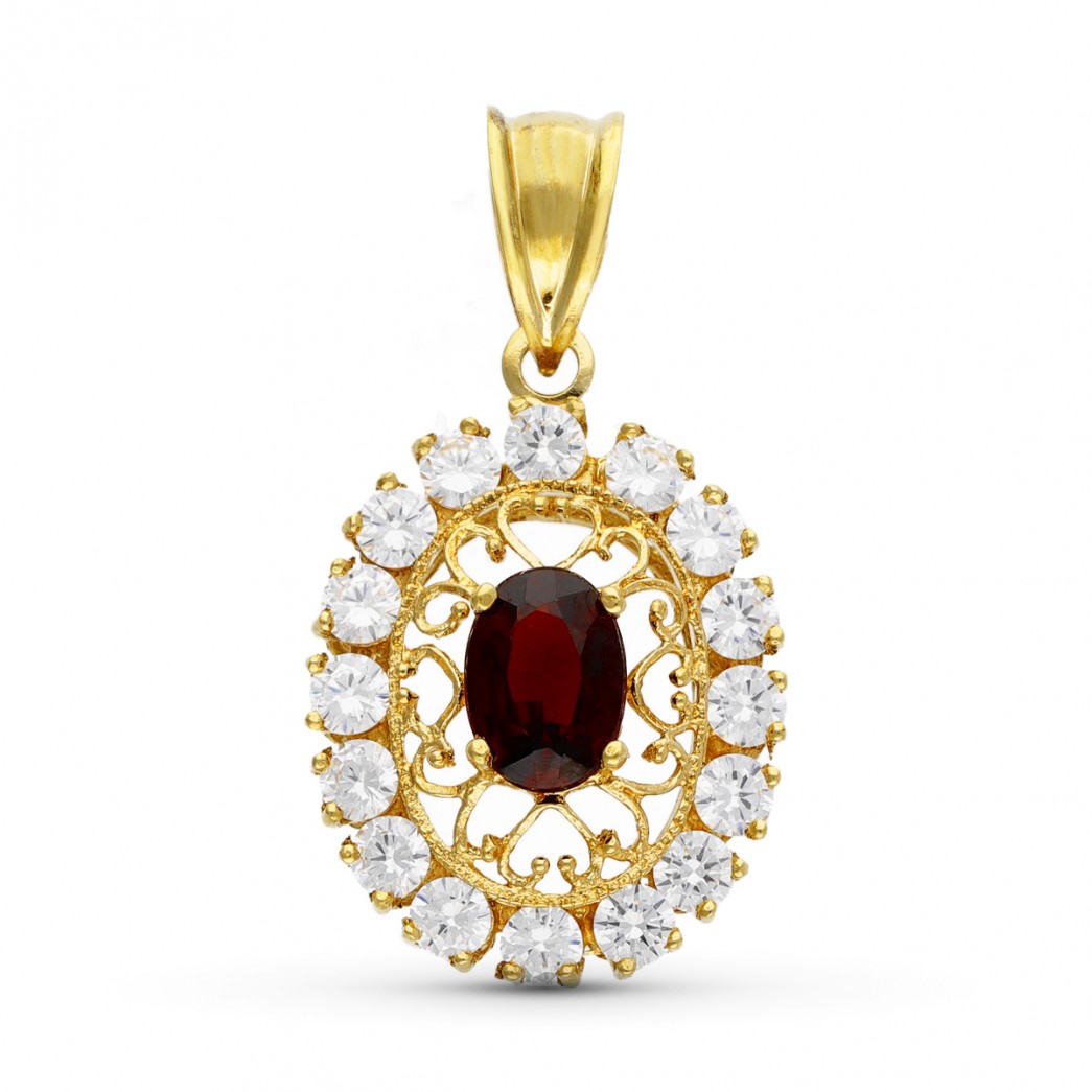 18K COLGANTE ORO AMARILLO FILIGRANA OVAL GRANATE Y CIRCONITAS