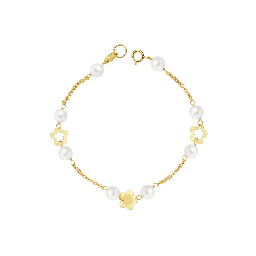 18K PULSERA PERLA Y FLORES 17 CM