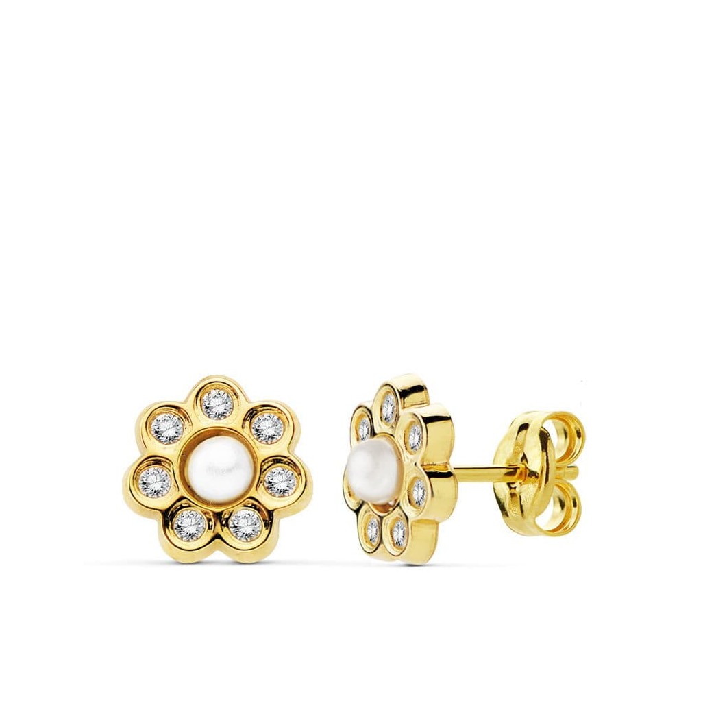18K PENDIENTES ORO AMARILLO FLOR 7 MM PERLITA Y CIRCONITAS
