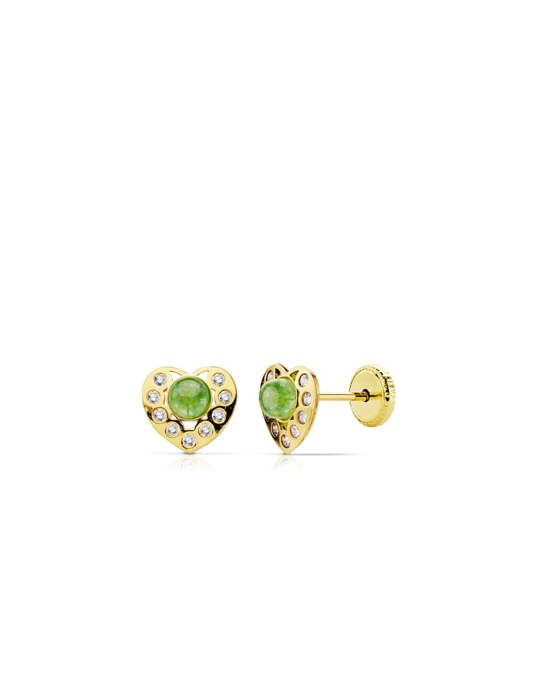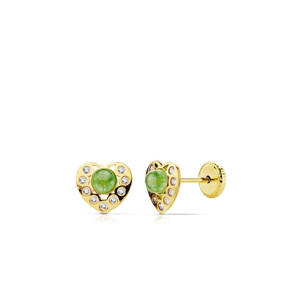 18K PENDIENTES ORO AMARILLO CORAZON PIEDRA VERDE Y CIRCONITAS ROSCA