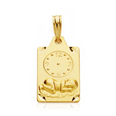 18K MEDALLA RECTANGULO NIÑO DE LA HORA CON RELOJ TALLADA 19X11 MM