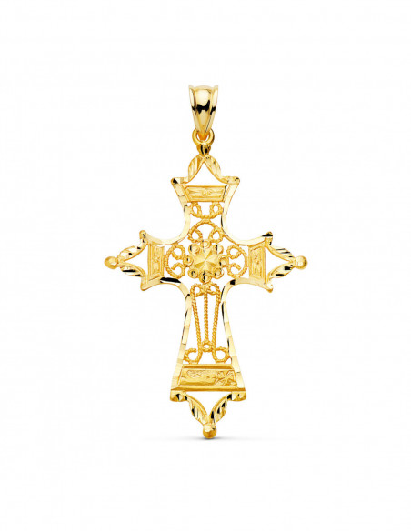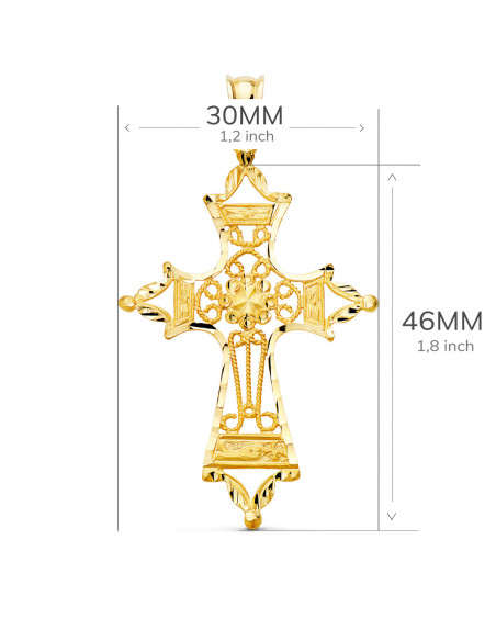 18K CRUZ ORO AMARILLO FILIGRANA BORDES TALLADOS. 46X30 MM