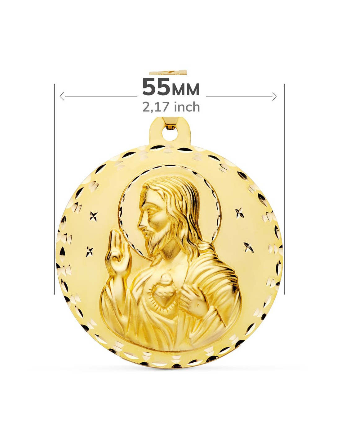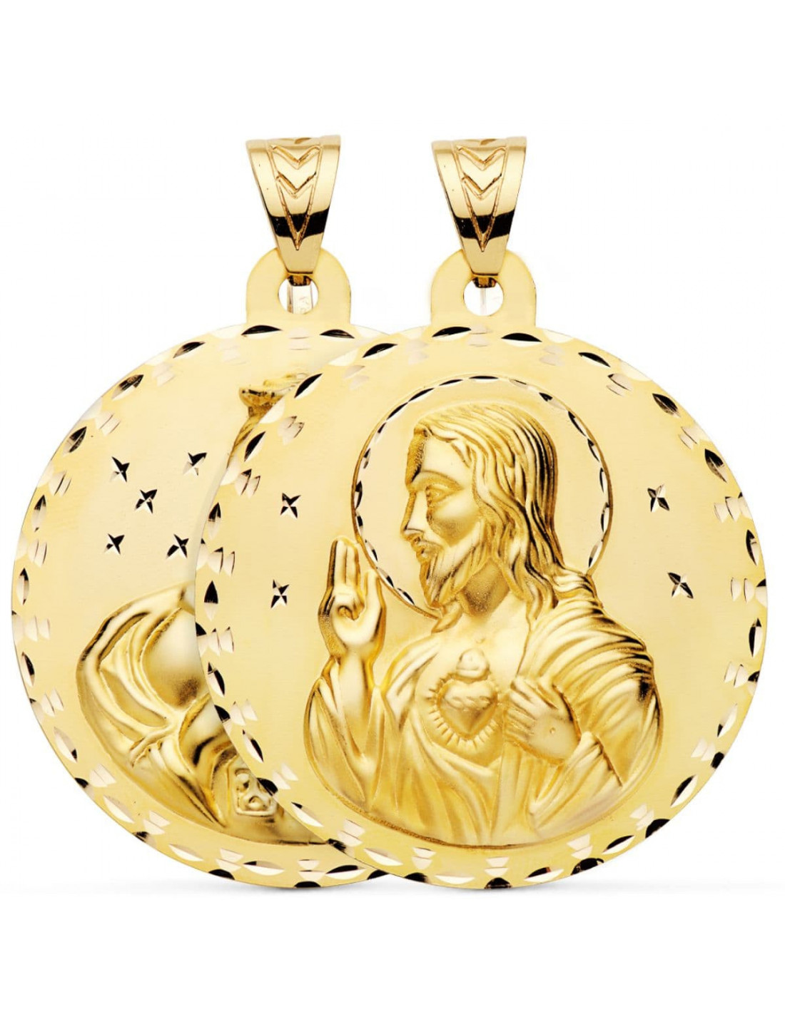 18K MEDALLA ESCAPULARIO TALLADO VIRGEN DEL CARMEN Y CORAZON DE JESUS 55 MM