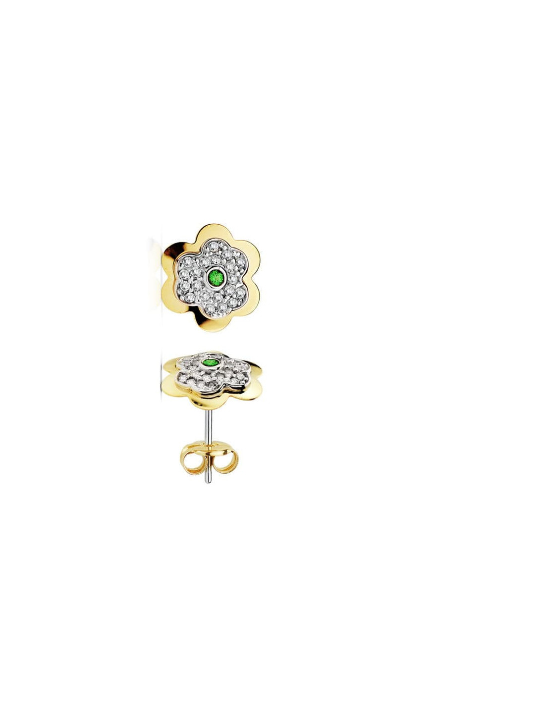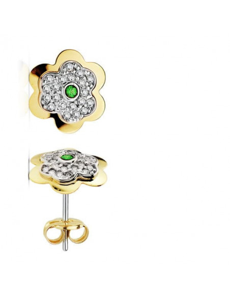 18K PENDIENTES ORO AMARILLO FLOR 6 HOJAS ESMERALDA CIRCONITAS 6 MM
