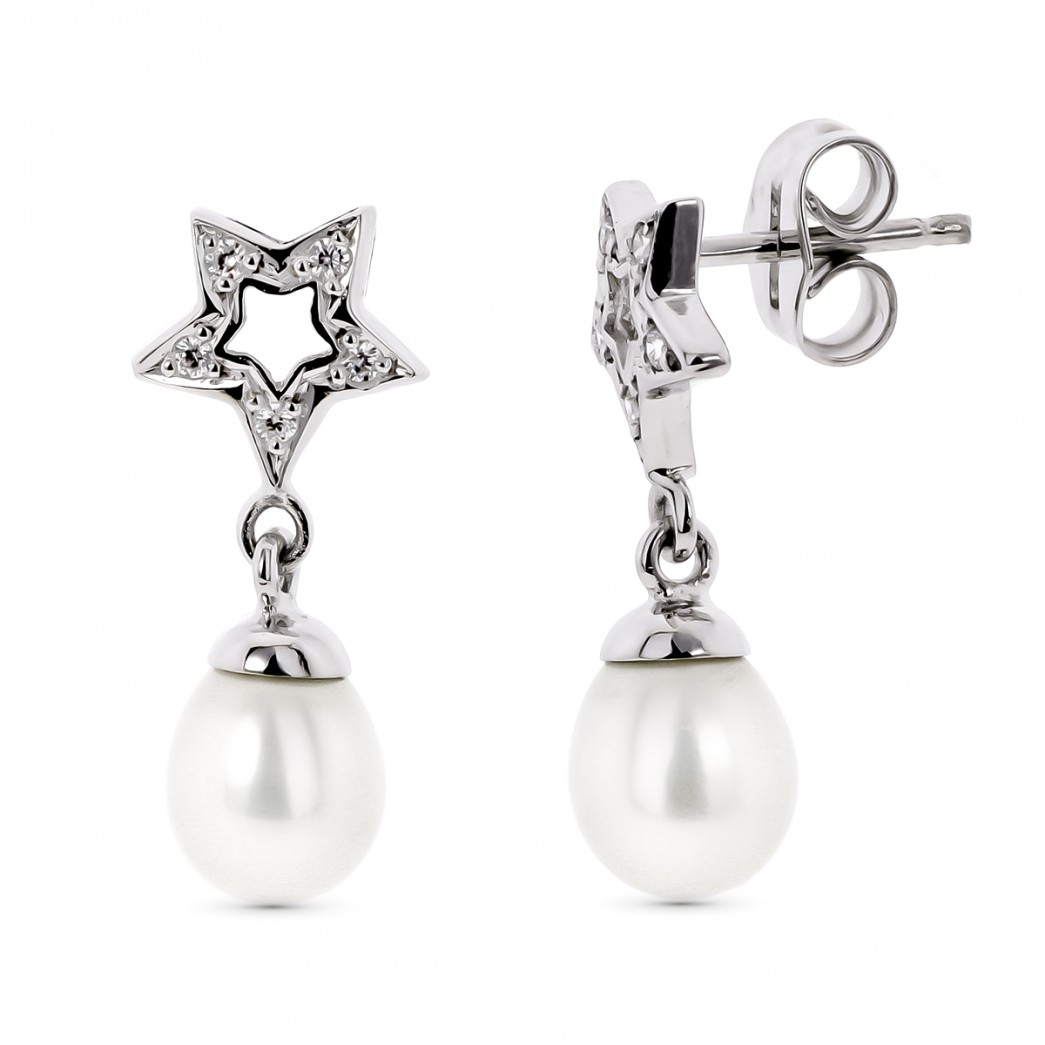 18K PENDIENTES ORO BLANCO DOS CUERPOS CON ESTRELLA Y PERLA CIERRE PRESION