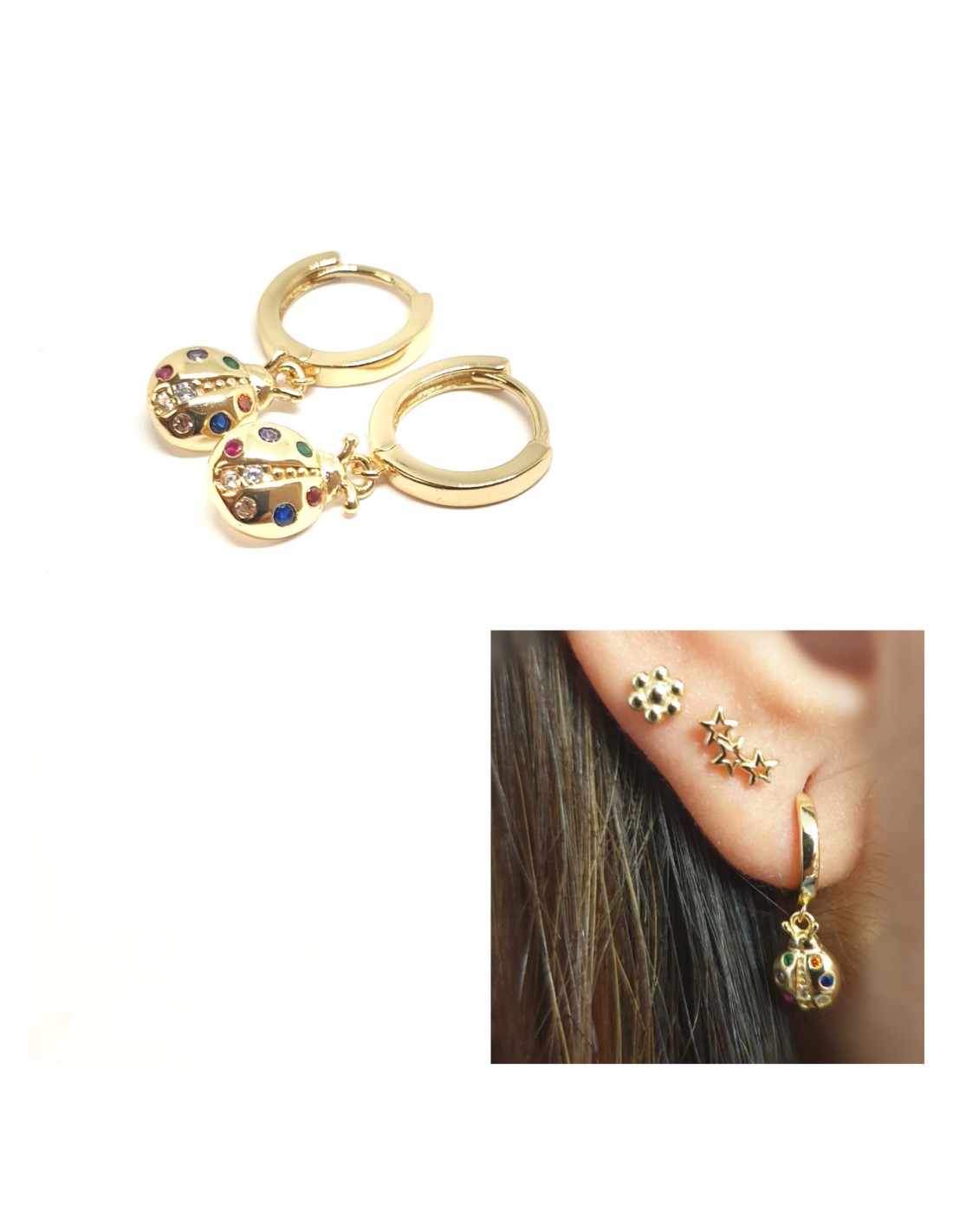 Pendientes mariquitas de la suerte en plata de ley con baño de oro 14 quilates.