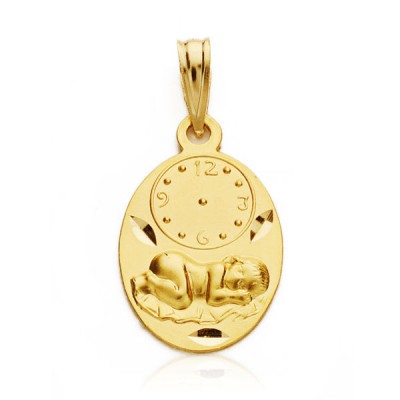 9K MEDALLA OVAL NIÑO DE LA HORA CON RELOJ TALLADA 19X12 MM