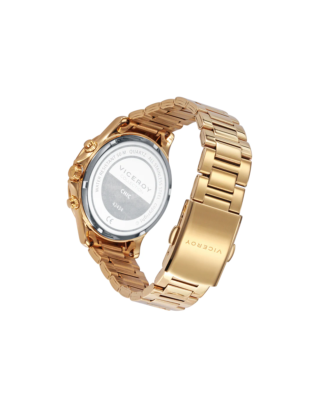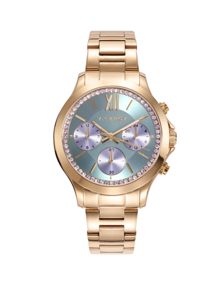 Reloj de mujer Viceroy Chic multifunción, caja y brazalete en acero en Ip dorado, esfera con circonitas en color verde, con indicadores en dorado.