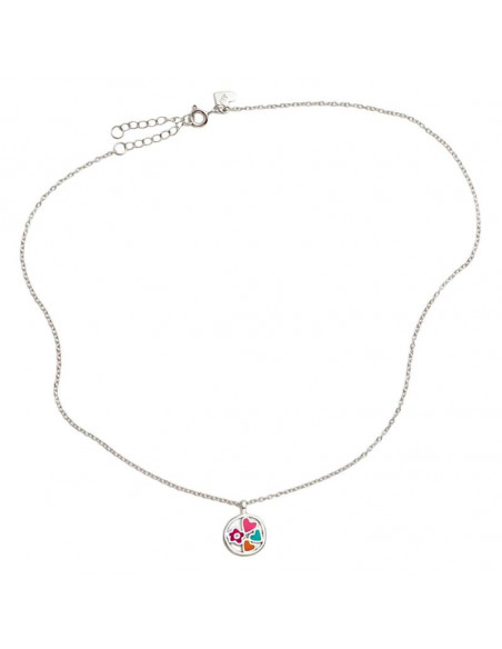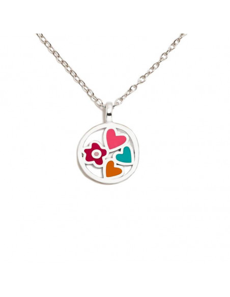 Gargantilla Agatha Ruiz de la Prada para mujer de la colección Rigoberta fabricada en plata bañada en rodio compuesta por una elegante y fina cadena plateada que da lugar a un colgante circular en cuyo interior cuenta con abalorios en forma de flor en esmalte fucsia, y corazones en esmalte fucsia, azul tiffany y naranja. Su cierre es de mosquetón ajustable.