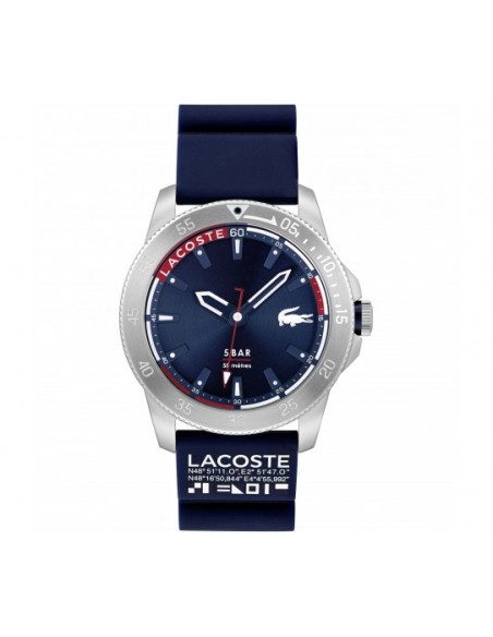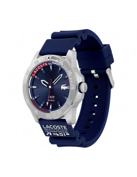 Reloj para caballero con caja de acero de 46mm. y cristal mineral. La correa es de caucho azul marino y es sumergible 5 atm. Tiene 3 años de garantía internacional