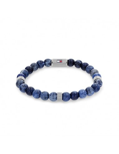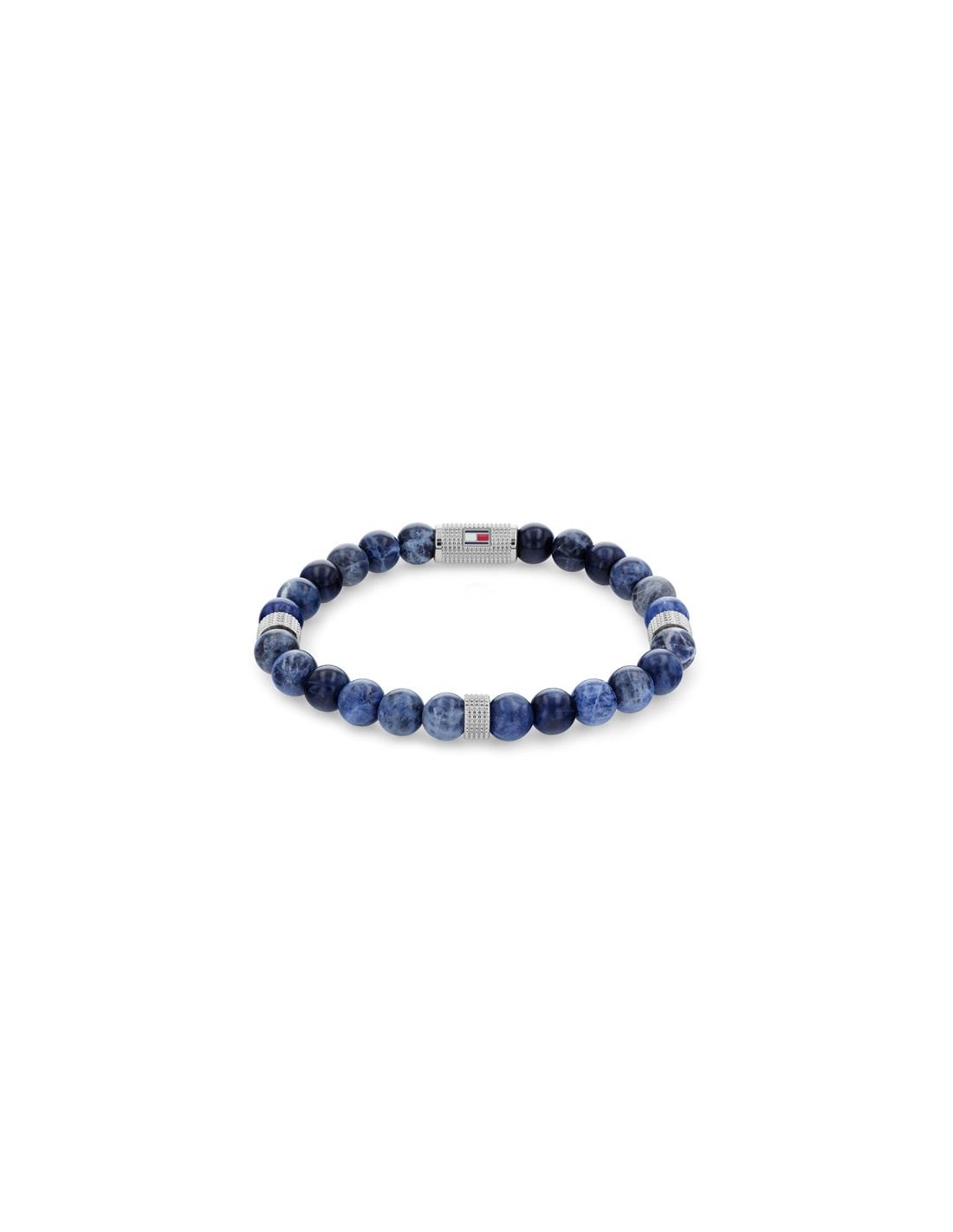Pulsera Tommy Hilfiger para hombre fabricada en acero inoxidable formada por cuentas en color azul de piedra Sodalita y detalles de piezas cilíndricas en plateado. Esta pulsera es de diseño elástico.
