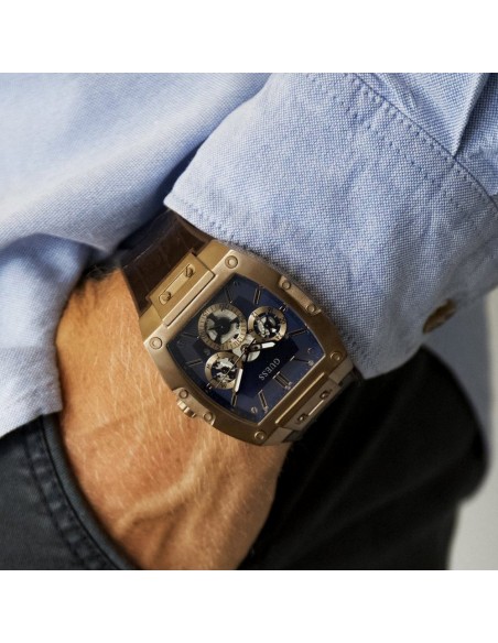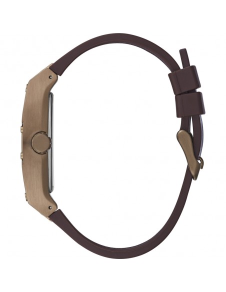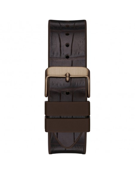 Este reloj marca Guess tiene una caja de Acero inoxidable revestido con capa de color con un diámetro de 43 mm y cuenta con una correa de Leather over silicone. Dentro de la caja se encuentra un mecanismo de Seiko Instruments Inc. de alta calidad el cual esta protegido por un cristal Mineral.