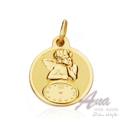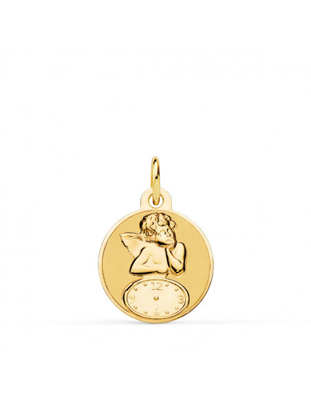 9K MEDALLA REDONDA ANGELITO BURLON CON RELOJ BRILLO Y MATE 15 MM