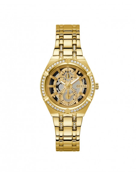 El reloj Guess ALLARA es una obra maestra moderna con su caja de acero de 36 mm y movimiento analógico multifunción. Su cristal mineral protege su esencia contemporánea, y la resistencia al agua de 30 metros garantiza su durabilidad. La pulsera dorada y la caja a tono le otorgan un estilo único y llamativo, adecuado para cualquier ocasión.