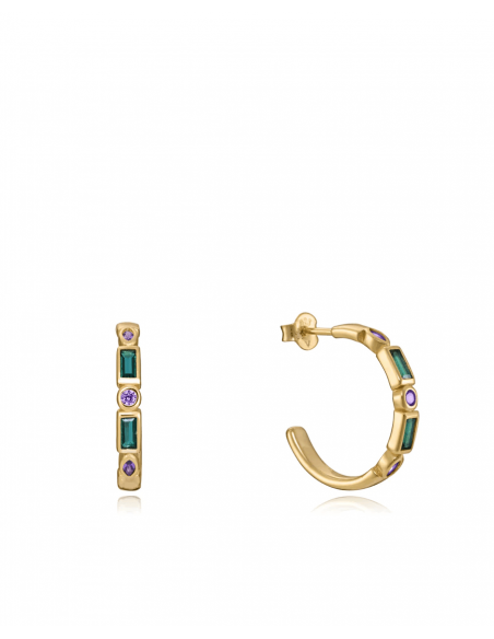 Pendientes dorados de semiaro de 2 cm de diámetro con circonitas moradas y verdes. Precioso contraste en unas joyas que deslumbran por su bella factura y perfección. El color de la esperanza es un clásico de la joyería, siempre sinónimo de belleza y elegancia. Luce este modelo y no pasarás desapercibida. Diámetro: 2 cm.