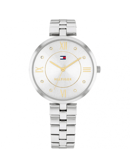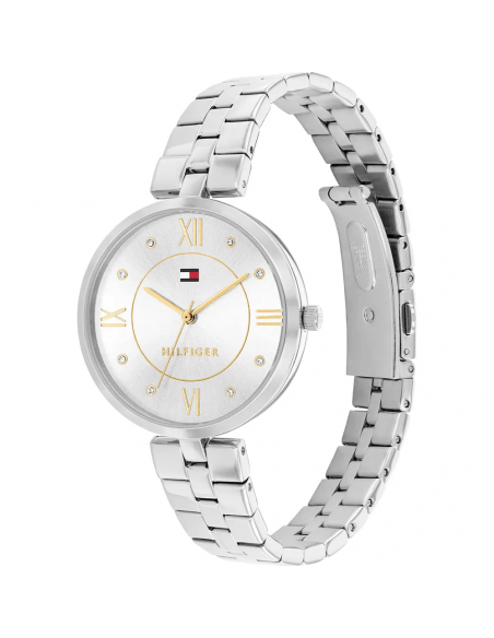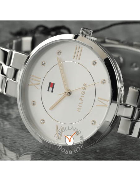 Este reloj marca Tommy Hilfiger tiene una caja de Inox con un diámetro de 34 mm y cuenta con una correa de metal. Dentro de la caja se encuentra un mecanismo de Seiko de alta calidad el cual esta protegido por un cristal Mineral.