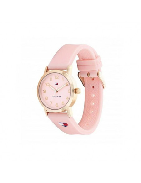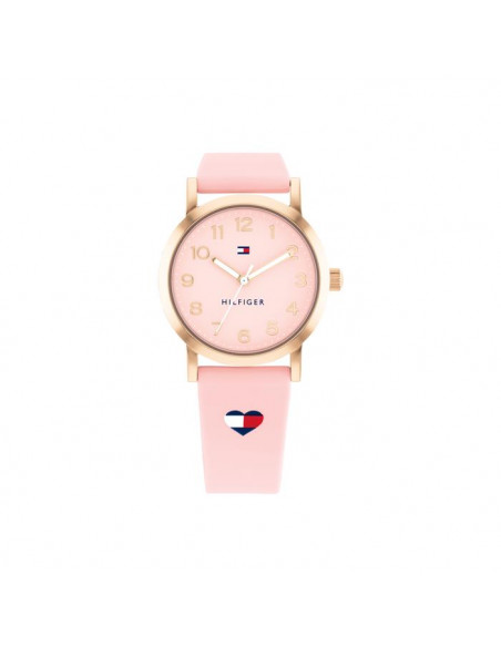 Reloj Tommy Hilfiger para niña de la colección Girls Comunion fabricado en acero inoxidable y silicona. Estamos ante un elegante y atractivo reloj compuesto por caja con baño rosado de 32mm de diámetro con esfera rosa que contiene índices y agujas en rosado movidas por mecanismo de cuarzo analógico protegido por cristal mineral. Su correa es de caucho en color rosa con un corazón que posee los colores de la marca Tommy Hilfiger. Su cierre es de hebilla. Resistente al agua hasta 30 metros.