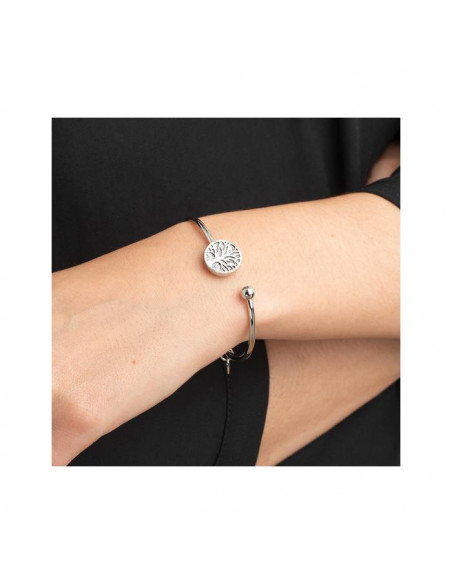Pulsera Lotus Style para mujer fabricada en acero inoxidable plateado de diseño rígido y abierta por sus extremos, uno de ellos acabado en una bolita y otro en forma circular con un árbol de la vida sobre fondo de circonitas brillantes.