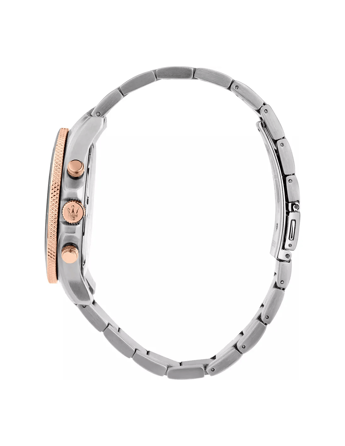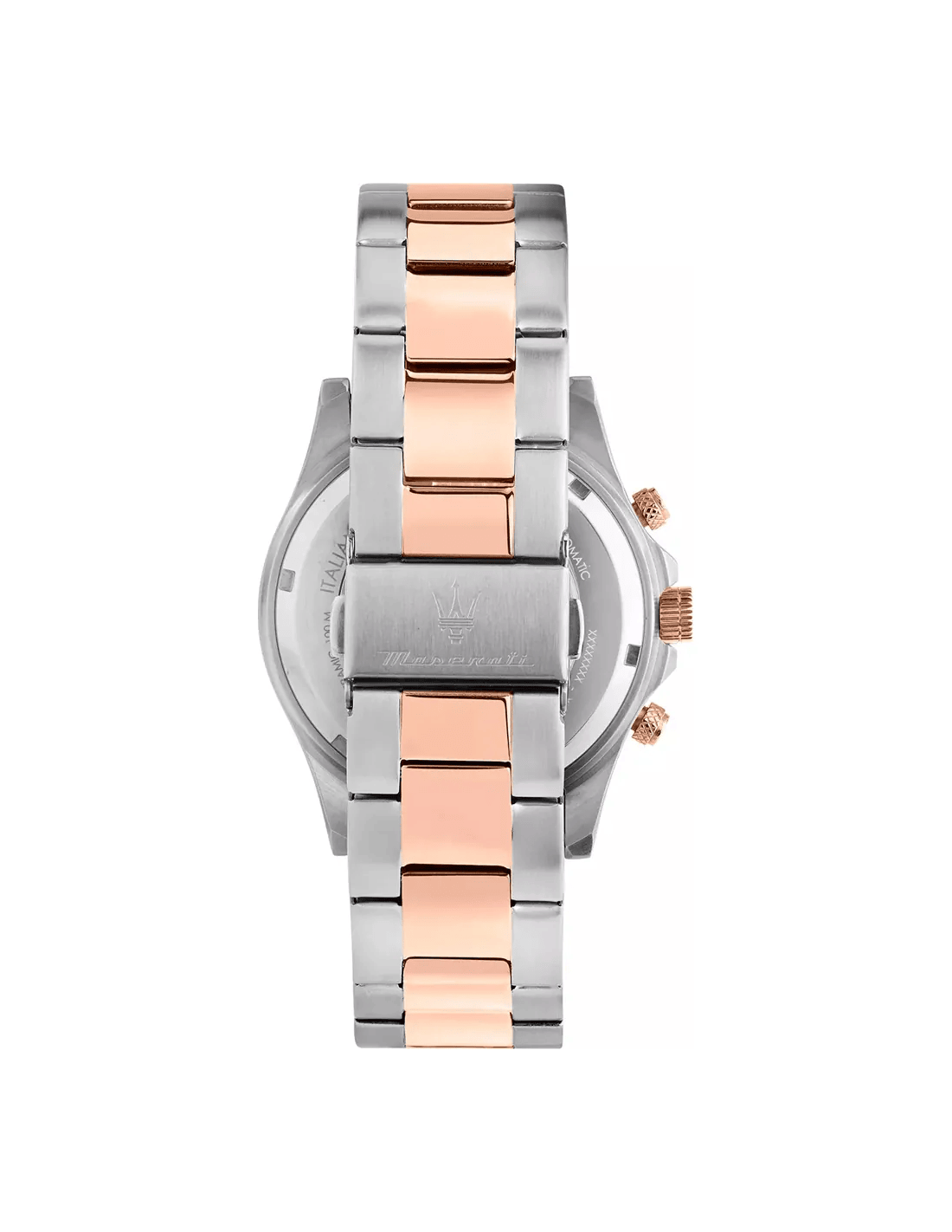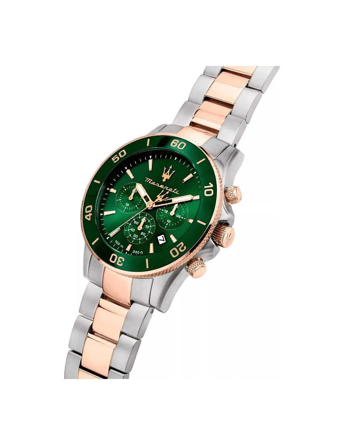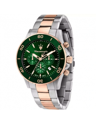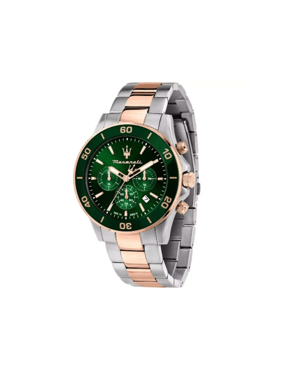 Reloj Maserati para hombre de la colección Competizione fabricado en acero inoxidable plateado, rosado y verde. Estamos ante un reloj de diseño elegante y lleno de atractivo debido a su combinación de colores. Se compone de caja de 43mm de diámetro en color verde al igual que su esfera que contiene indicadores y agujas en rosado movidas por mecanismo de cuarzo con función de cronógrafo y calendario. Todo ello protegido por cristal mineral. Su brazalete lo forman eslabones plateadosy rosados con cierre desplegable. Resistente al agua hasta 10 ATM.
