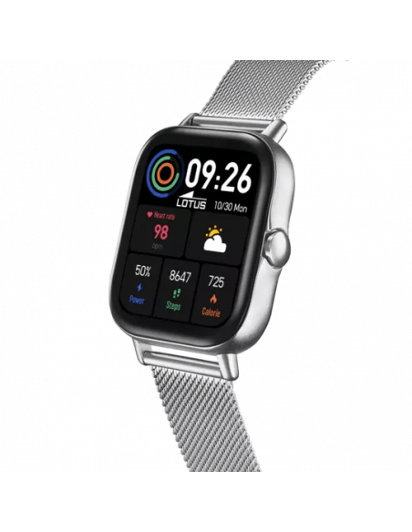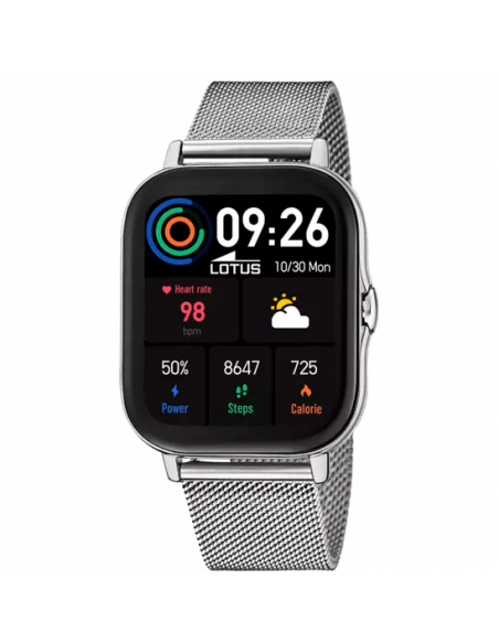 El smartwatch Lotus 50044/1 para hombre es una elegante combinación de diseño contemporáneo y funcionalidad moderna. La caja rectangular de aleación de zinc tiene un diámetro de 44.2 mm y un único pulsador. La esfera negra es clara y fácil de leer, mientras que la correa de acero inoxidable 316l en un elegante tono gris plata le da un toque sofisticado.