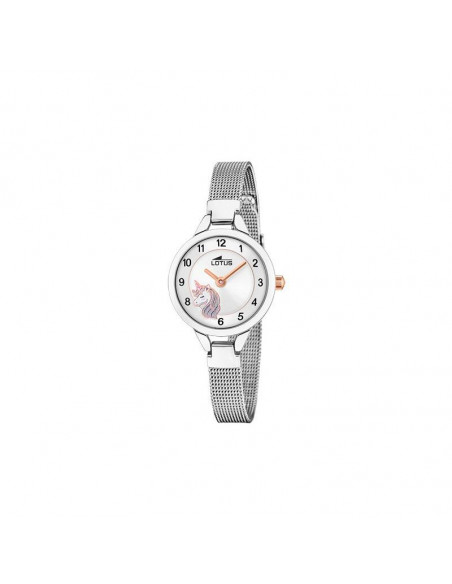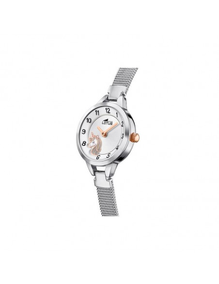 Reloj Lotus para niña de la colección Junior fabricado en acero inoxidable plateado. Se trata de un original y atractivo reloj compuesto por caja de 25mm de diámetro con caja plateada con un detalle en rosado en forma de unicornio y con índices en color negro con agujas en rosado