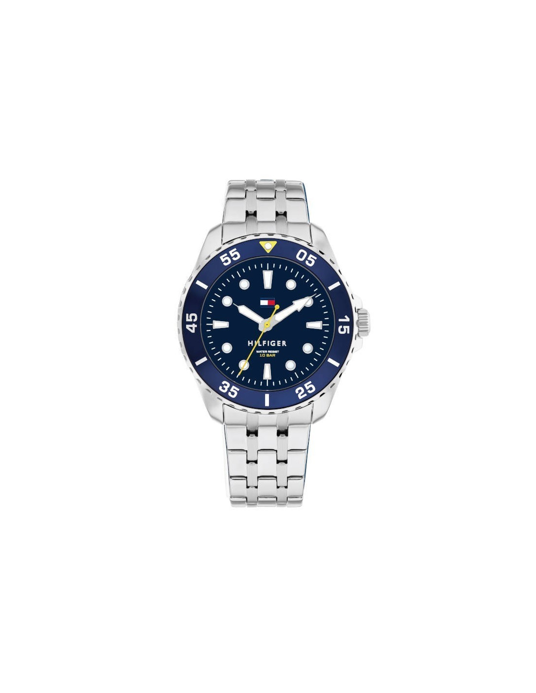 Reloj Tommy Hilfiger para niño de la colección Boys ideal como regalo de comunión fabricado en acero inoxidable plateado y azul. Estamos ante un atractivo reloj compuesto por caja de 34 mm de diámetro con bisel azul al igual que su esfera compuesta por indicadores luminiscentes al igual que sus agujas movidas por mecanismo de cuarzo analógico protegido por cristal mineral.
