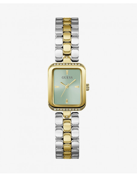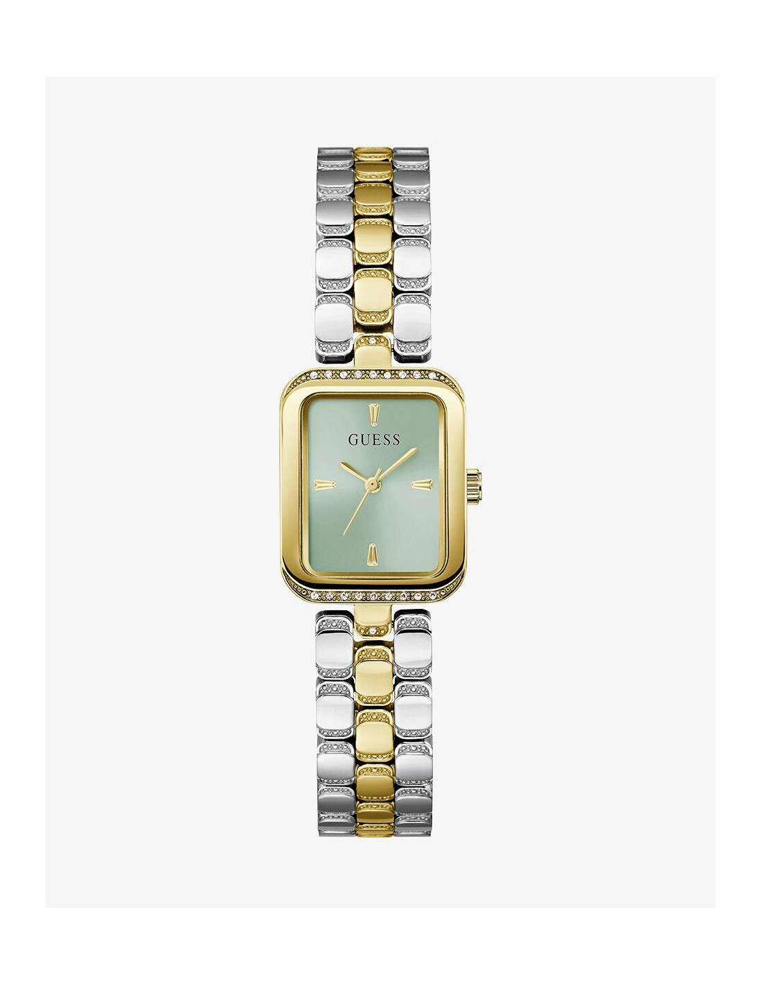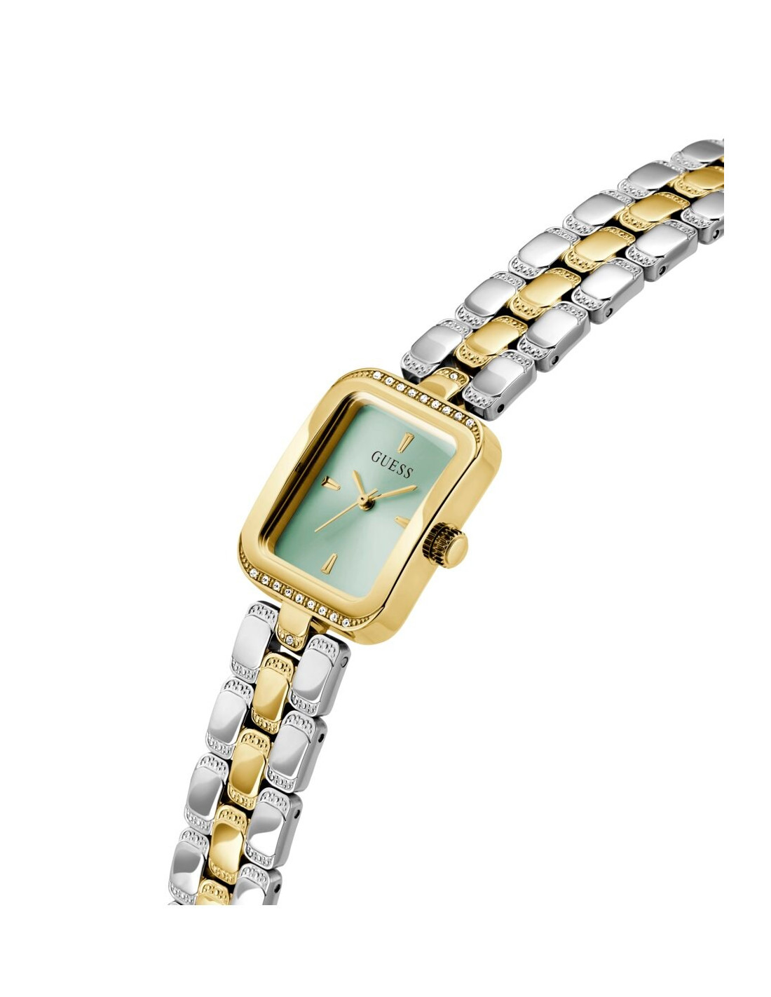 Reloj de mujer Isla GW0865L4 de acero y correa bicolor. Reloj de mujer de la marca Guess con caja de acero reciclado brillante 22mm dorada con cristales y pedrería, esfera rayos de sol verde claro, brazalete de acero reciclado brillante bicolor dorado y plateado con abalorios. Clásico, sofisticado y sencillo, el ISLA es un reloj que irradia elegancia con su diseño minimalista. Perfecto para quienes buscan un toque de distinción en su día a día sin renunciar a la simplicidad y el buen gusto.