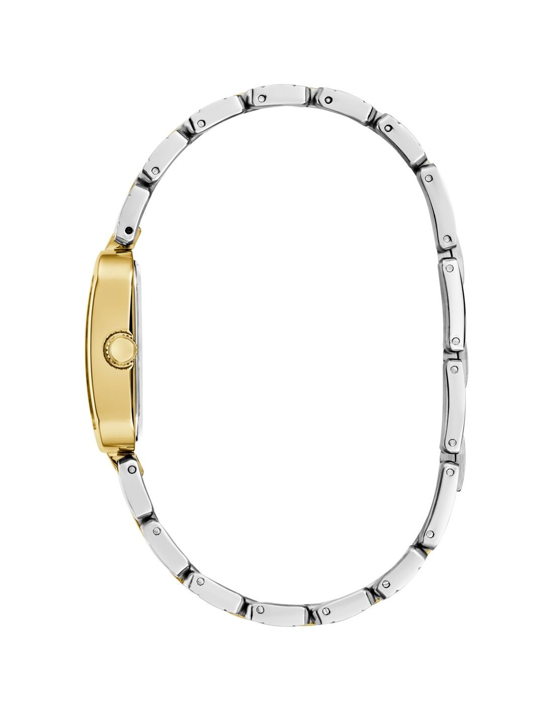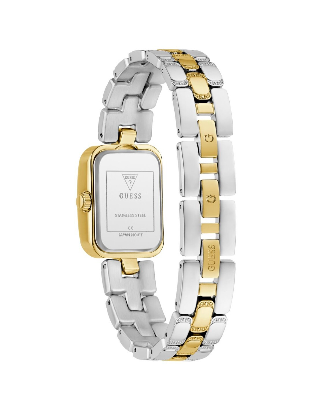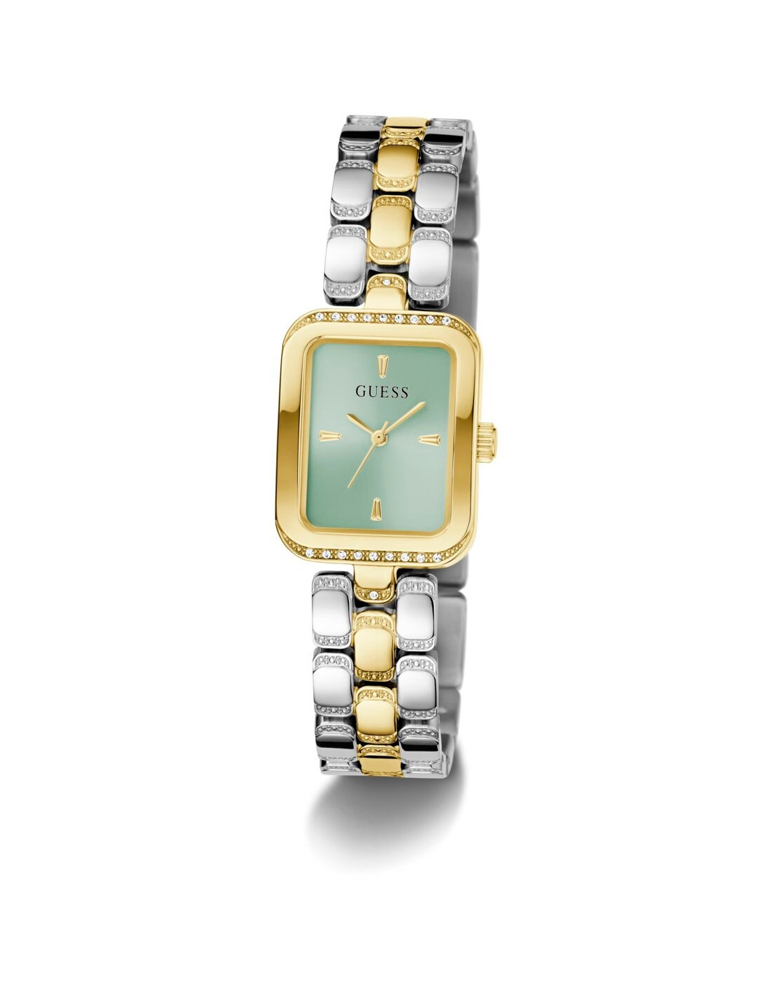 Reloj de mujer Isla GW0865L4 de acero y correa bicolor. Reloj de mujer de la marca Guess con caja de acero reciclado brillante 22mm dorada con cristales y pedrería, esfera rayos de sol verde claro, brazalete de acero reciclado brillante bicolor dorado y plateado con abalorios. Clásico, sofisticado y sencillo, el ISLA es un reloj que irradia elegancia con su diseño minimalista. Perfecto para quienes buscan un toque de distinción en su día a día sin renunciar a la simplicidad y el buen gusto.
