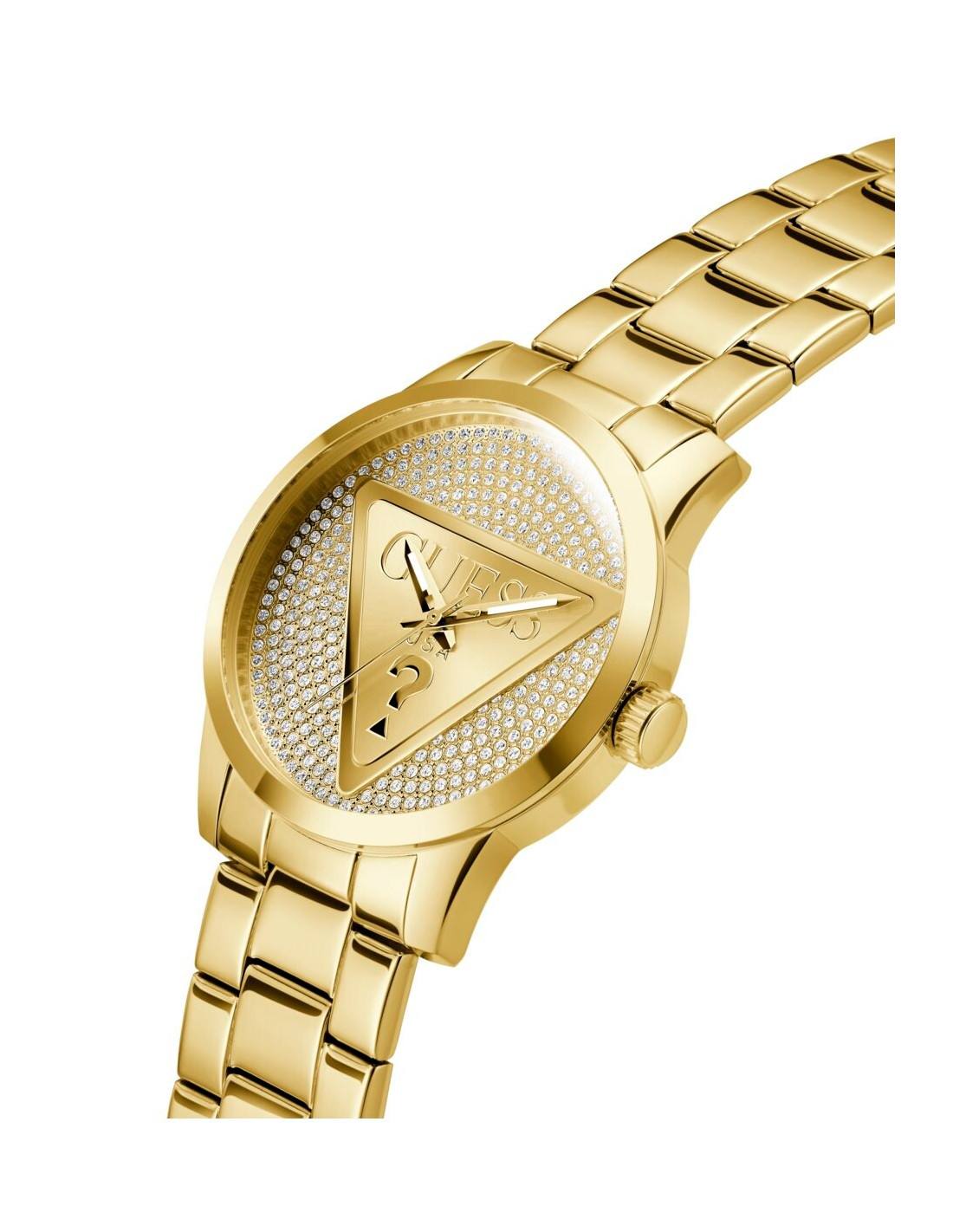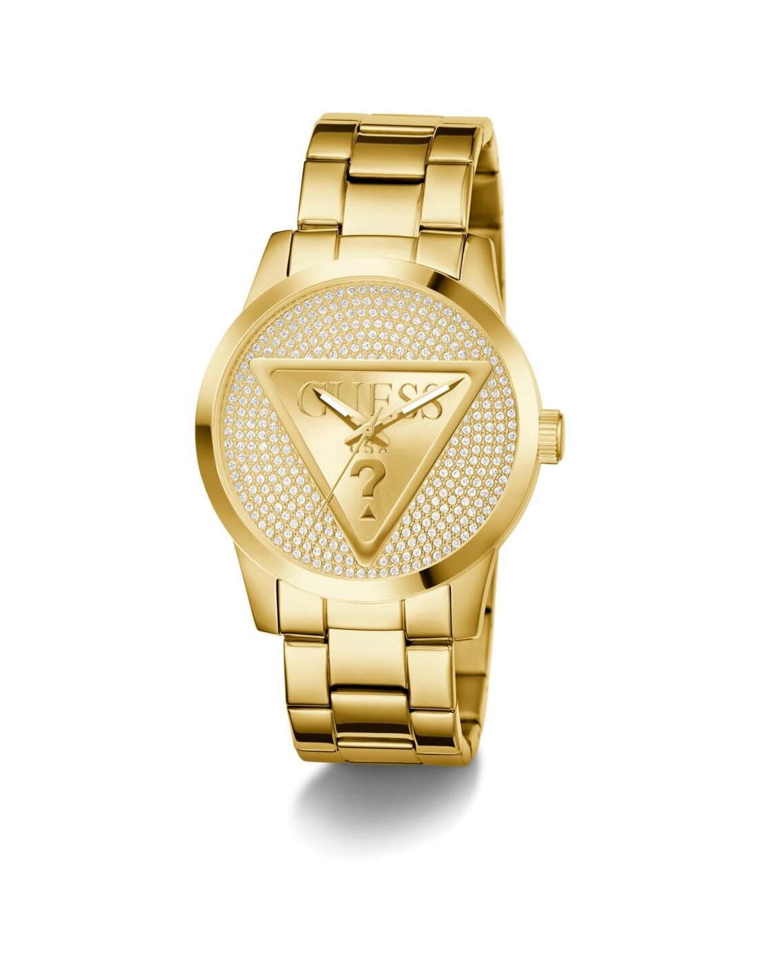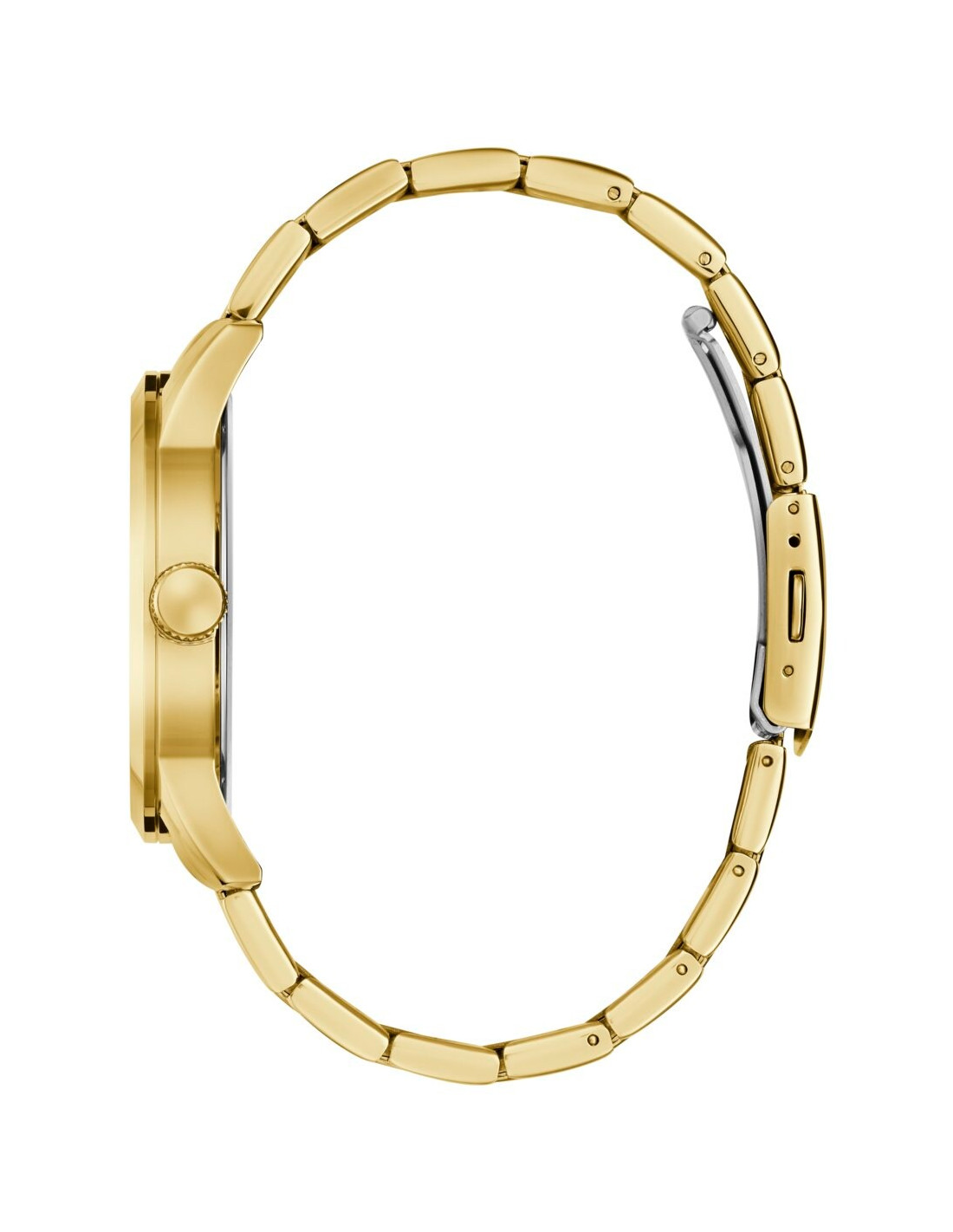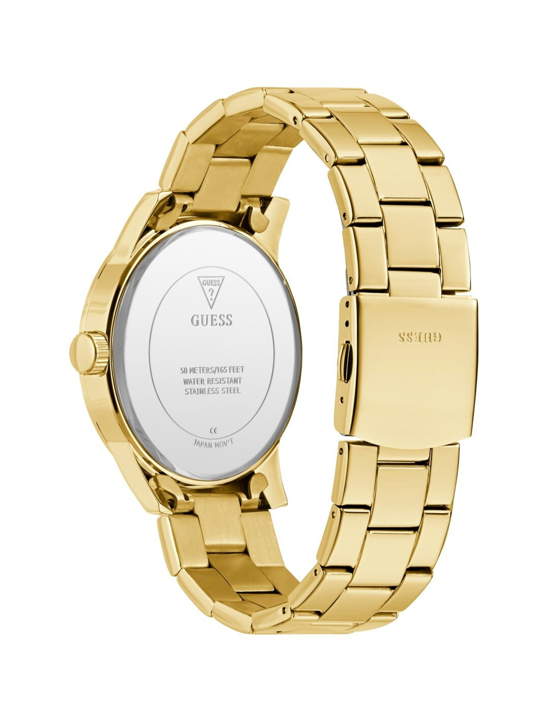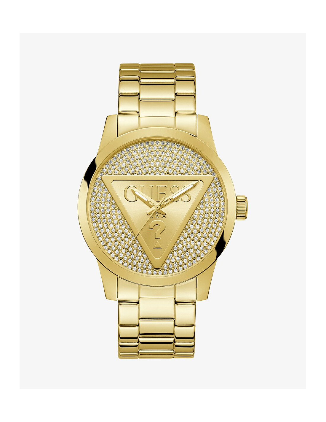 Reloj de hombre Badge GW0915G1 de acero y correa dorada. Reloj de hombre Guess con caja de acero reciclado brillante 44mm dorado, esfera de rayos de sol dorado con logotipo triangular Guess dorado y cristales blancos, brazalete de acero brillante dorado. Atrae todas las miradas con el BADGE, un reloj con una composición equilibrada. Diseñado para el hombre moderno que busca estilo y funcionalidad, este reloj presenta una estética robusta y elegante. El logo de GUESS, distintivo y elegante, refuerza su identidad de marca, convirtiéndolo en el complemento ideal para cualquier ocasión.
