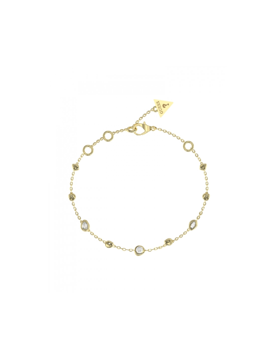 Brazalete de acero para mujer de la marca Guess. Cadena dorada sencilla intercalada con diseño de piedras de múltiples formas con cristales blancos. Inspirada en la serenidad de Panarea, esta colección fusiona la elegancia contemporánea con la belleza natural de piedras de formas libres, evocando la esencia única de la isla. Cada pieza refleja la tranquilidad y el estilo distintivo de Panarea.