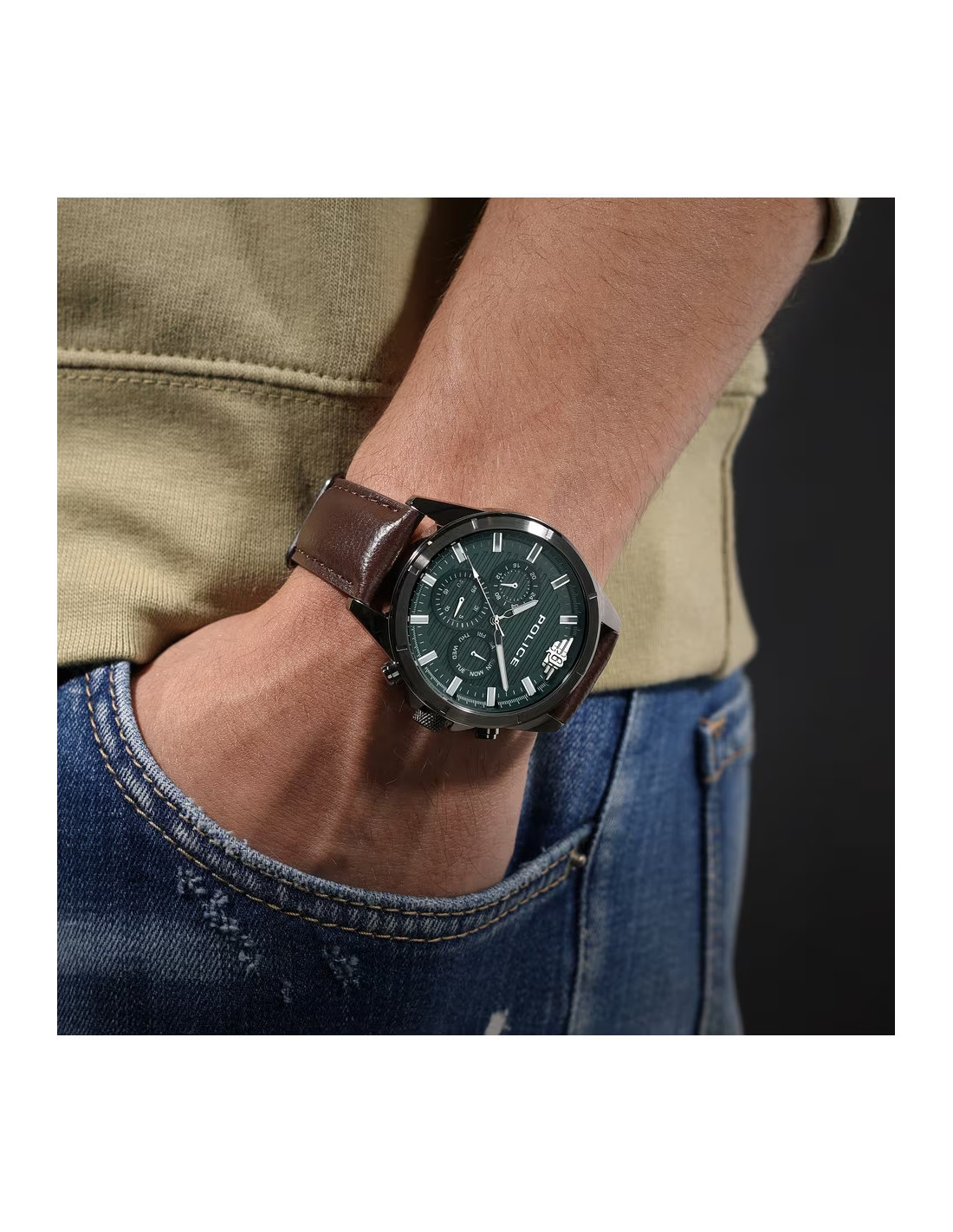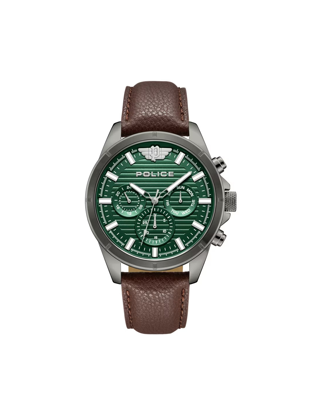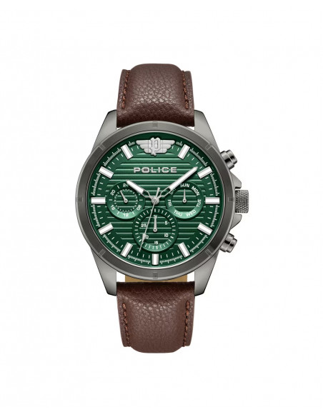 "El reloj MALAWI permite encarnar al instante el espíritu de un rebelde urbano. Con un diseño lleno de notas atrevidas, este reloj multifunción demuestra que la versatilidad puede crear un estilo que trasciende las estaciones. Añadiendo un giro al diseño, cuenta con dos estilos distintivos de textura horizontal en la esfera y el icónico logotipo de las alas ""P"" de POLICE en la posición de las 12, que refuerzan su carácter audaz y expresivo. Esta temporada, el reloj MALAWI viene con una correa de cuero acolchada en color marrón y una esfera verde ofreciendo un estilo contemporáneo para todos."