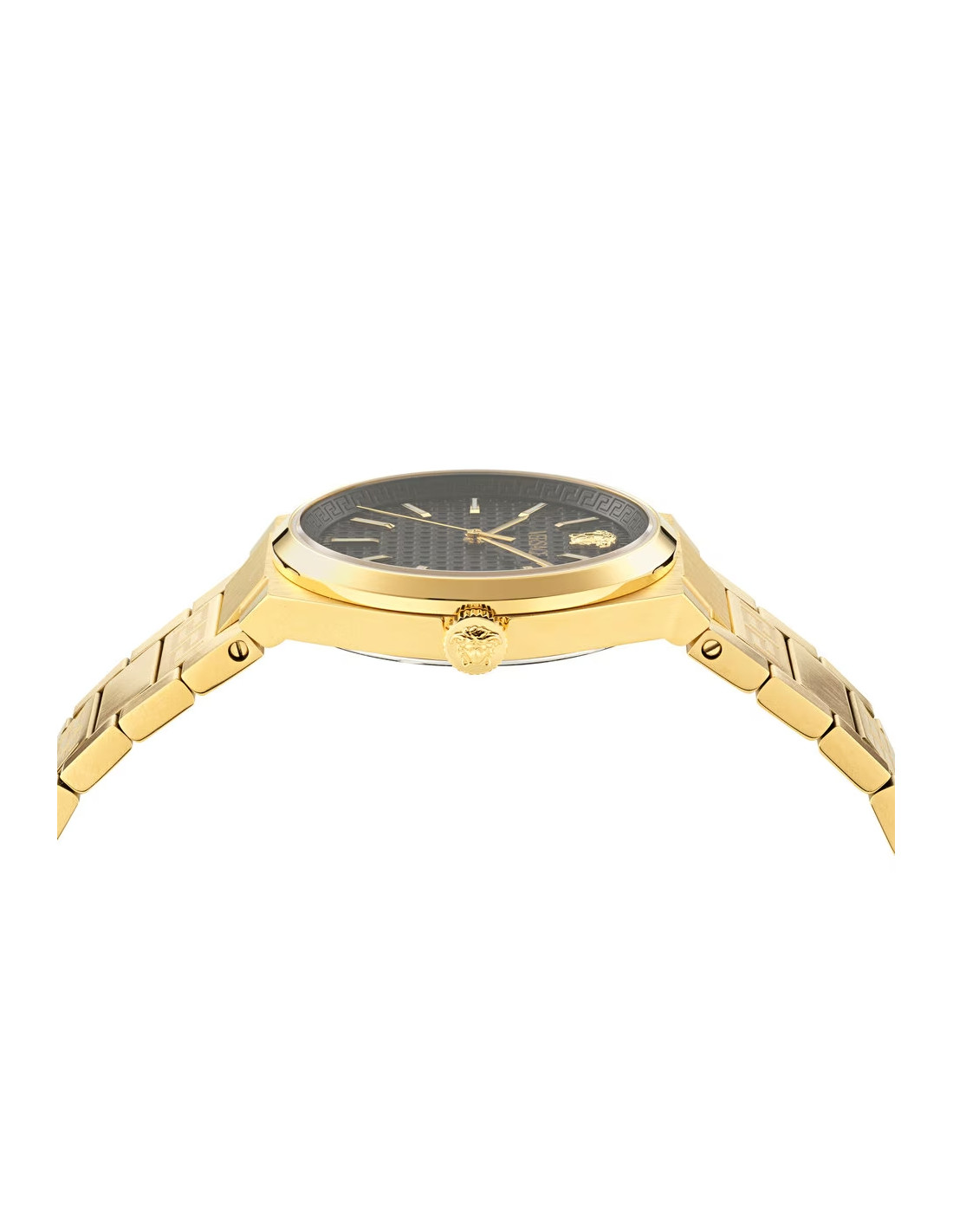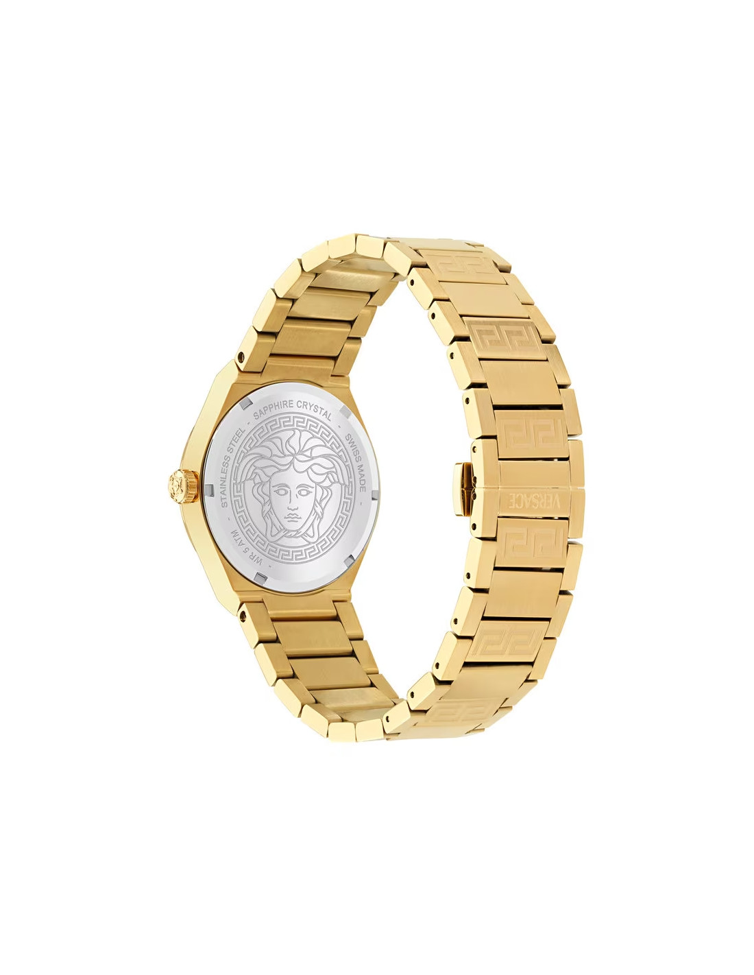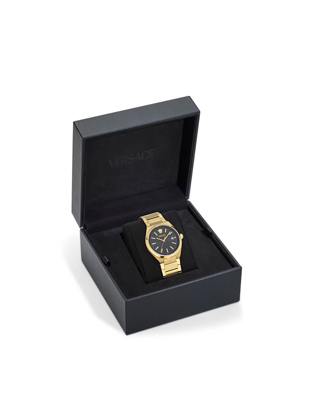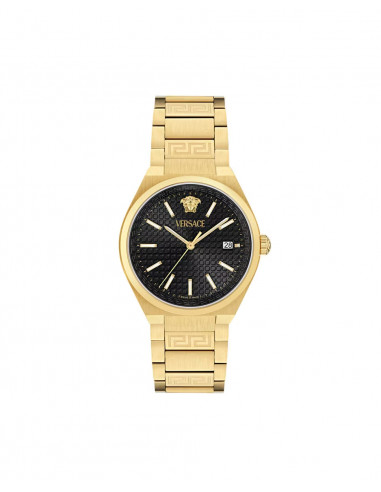 Reloj de hombre Versace con caja 39mm de acero inoxidable, esfera guilloché negra, brazalete dorado, movimiento de cuarzo suizo de 3 agujas, cabeza de medusa y logotipo de Versace a las 12h. Atemporal, elegante e icónico, así es el nuevo V-AURIA. Una caja que abraza una esfera guilloché con la ventana de fecha a las 3h y varios son los símbolos que recuerdan el ADN de la marca Versace, como la greca tono sobre tono en el bisel interior, la cabeza de Medusa y el logotipo de Versace a las 12.
