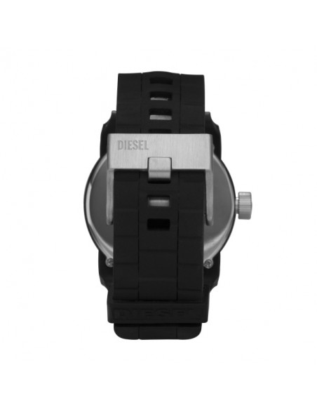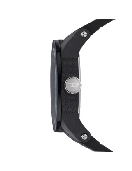 Reloj de hombre con caja de acero IP negro de 52 X 44 mm., esfera negra con bisel negro de nylon y correa dos piezas de silicona negra de 24 mm., con hebilla plateada.