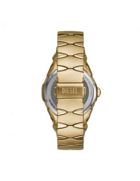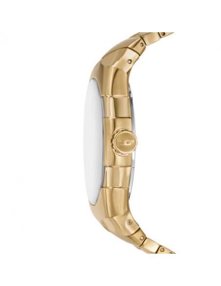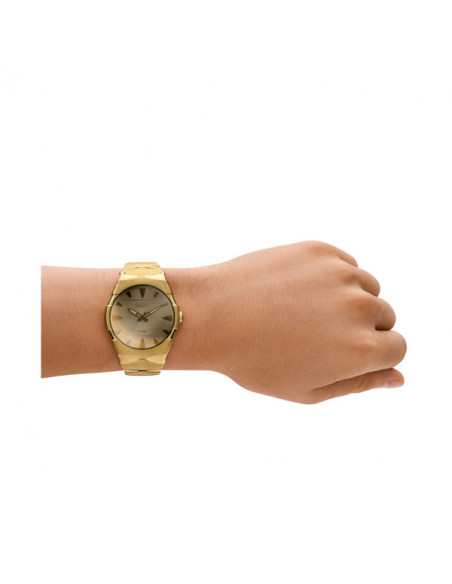 Reloj tres agujas con caja de acero inoxidable, esfera blanca y brazalete de acero en color oro.