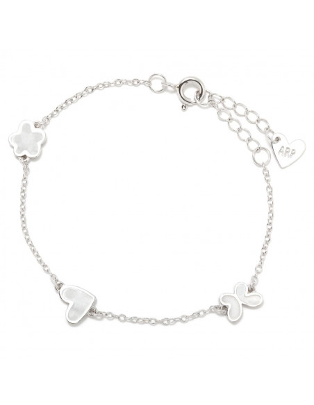 Pendientes de plata de ley, nácar y baño de oro. Cierre de mosquetón y cadena de extensión.