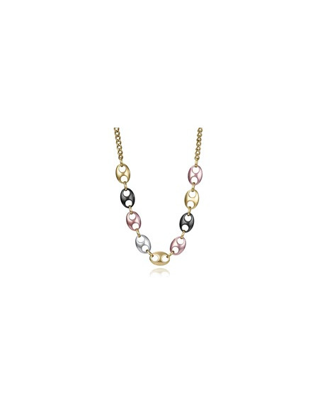 Collar de mujer en acero tipo calabrote con acabados en IP dorado, negro y rosa ofrece un diseño único y vibrante. Su combinación de colores aporta un toque moderno y sofisticado, mientras que su estructura calabrote le da un aire distintivo y contemporáneo. Con un largo de 42 cm más 3 cm de extensión, se ajusta cómodamente a tu cuello, adaptándose a tu estilo con facilidad. Perfecto para quienes buscan un accesorio audaz que resalte con elegancia.