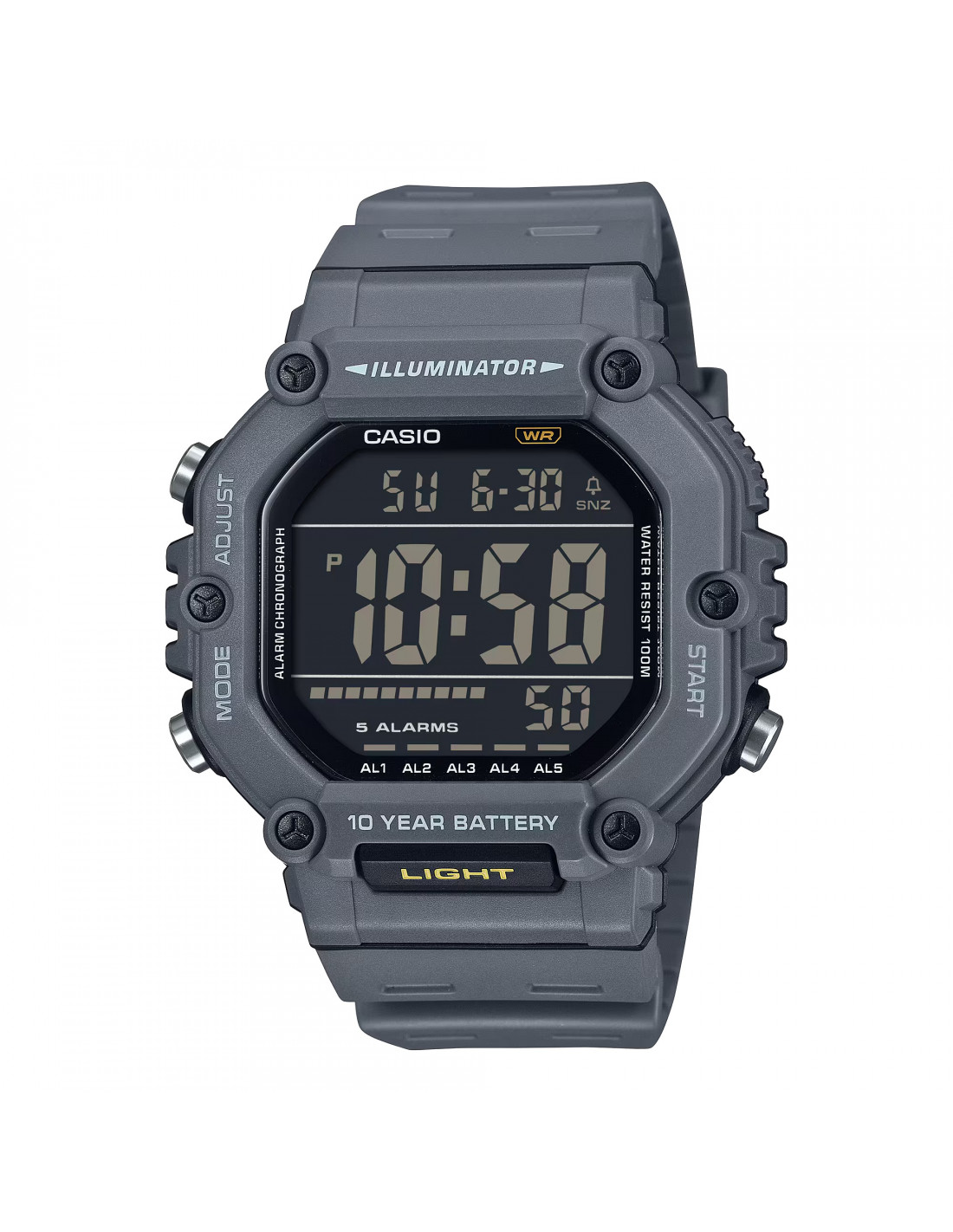 Estilo audaz y funcionalidad práctica: un reloj resistente con una pantalla LCD grande, de fácil lectura y uso, y una caja de diseño atrevido. Accede fácilmente a la luz LED mediante un botón en la parte frontal de la caja para una mayor comodidad. Con una resistencia al agua de 10 bar. Equipados con doble función horaria, cronómetro, temporizador, alarma y mucho más, estos relojes te mantienen informado durante todo el día, desde el deporte y el ocio hasta el trabajo y prácticamente cualquier otra actividad.