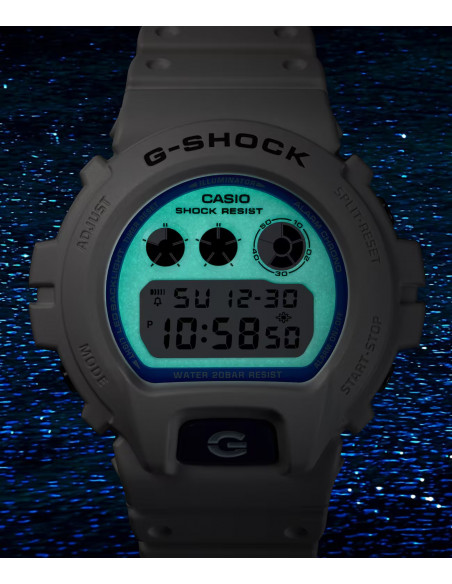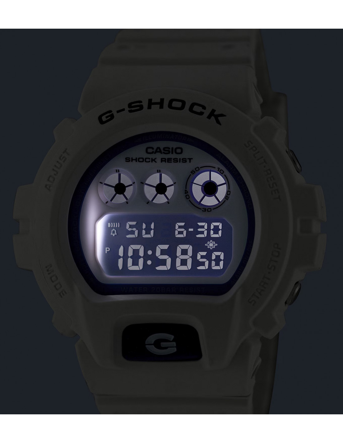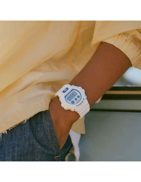 Déjate inspirar por los mares del verano con este G-SHOCK blanco y azul. Su esfera fosforescente evoca el brillo mágico del plancton bioluminiscente por la noche, mientras que la combinación de colores transmite la transición del día a la noche junto al mar. Un diseño fresco que fluye con naturalidad entre lo casual y lo profesional.