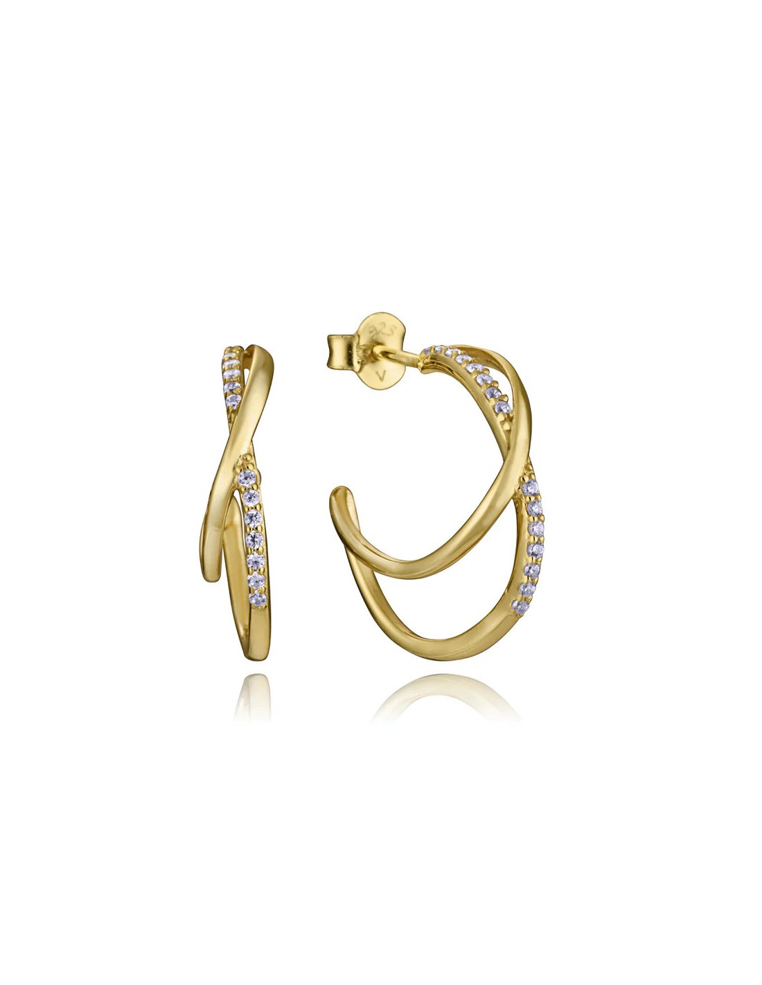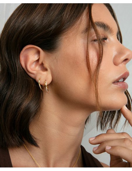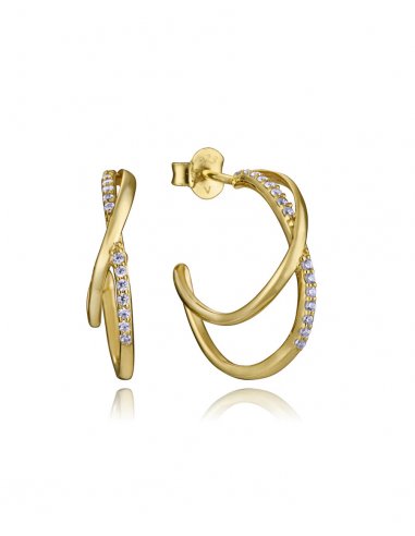 Equilibrio perfecto entre elegancia y originalidad se refleja en estos pendientes de plata de primera ley con baño de oro. Su diseño de doble aro cruzado, adornado con circonitas blancas, crea un efecto sofisticado que capta la luz con cada movimiento. Con un largo de 1,8 cm, son ideales para quienes buscan una joya distintiva que eleve sus looks tanto de día como de noche. Una creación de Viceroy pensada para brillar con estilo propio.
