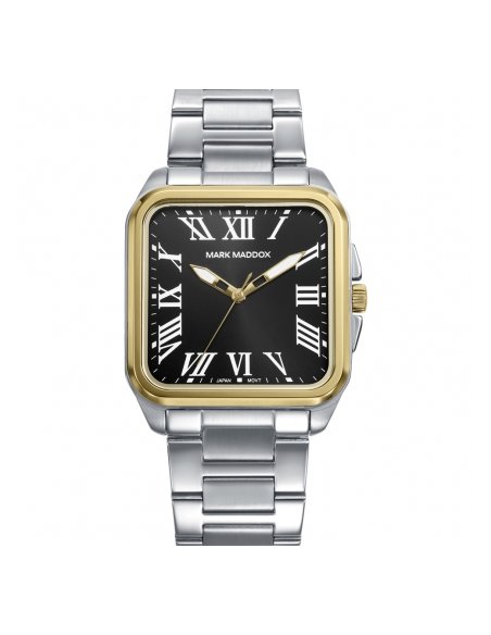 Con un estilo que mezcla tradición y modernidad, este reloj de hombre presenta una caja bitono de acero con baño Ip dorado y una esfera negra marcada con números romanos. Las agujas en color dorado y el cristal mineral ofrecen precisión y resistencia, convirtiendo esta pieza en un accesorio elegante y sofisticado, ideal para cualquier ocasión.