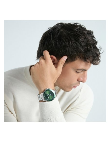 Con un estilo que combina frescura y sofisticación, este reloj de hombre luce una caja de acero rosa y un brazalete de acero que aportan solidez y elegancia. Su esfera verde con índices y las agujas horarias en color plata ofrecen claridad y precisión, mientras que el cristal mineral garantiza durabilidad. Una pieza perfecta para quienes buscan un accesorio moderno que destaque con sutileza.
