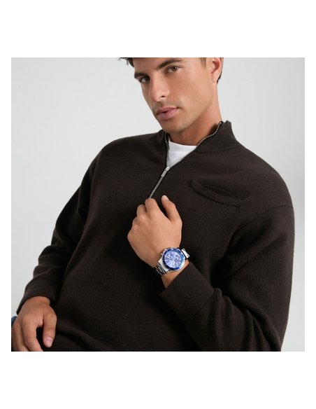 Un clásico contemporáneo, este reloj de hombre cronógrafo combina una robusta caja y brazalete de acero con una elegante esfera azul marcada con índices precisos. Las agujas horarias y contadoras en color plata, junto al cristal mineral, aseguran funcionalidad y resistencia, convirtiéndolo en un accesorio sofisticado que aporta estilo y carácter a cualquier look.