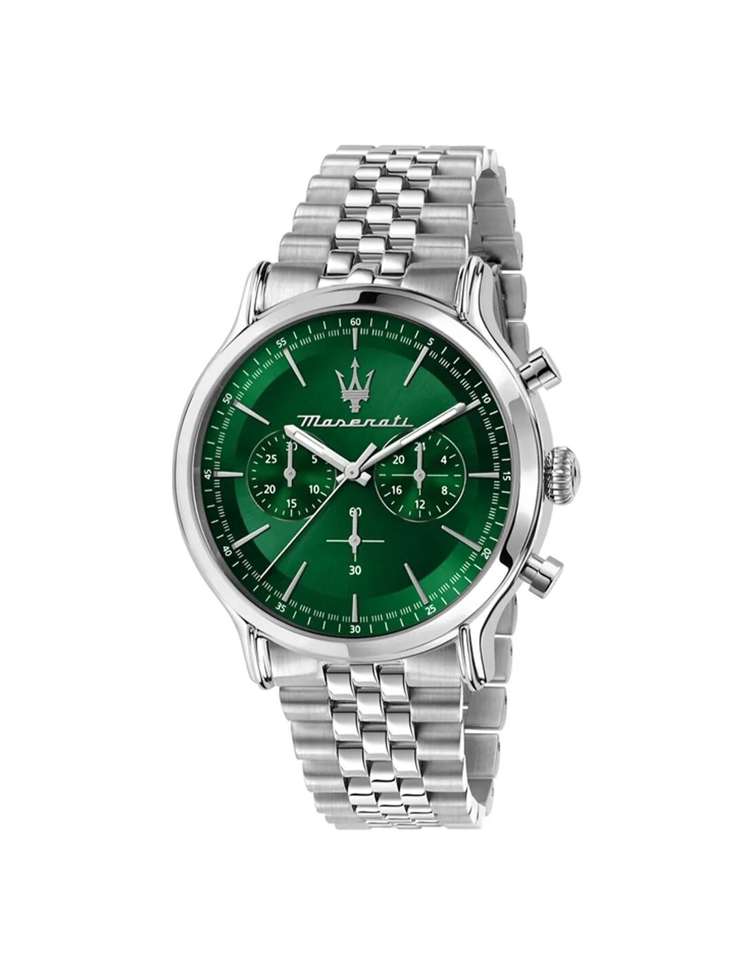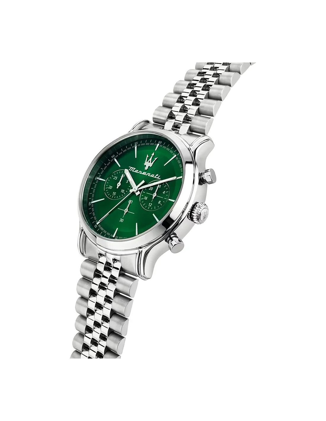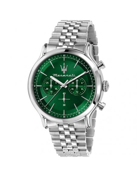 Reloj Maserati para hombre de la colección Epoca fabricado en acero inoxidable plateado y verde. Estamos ante un atractivo y elegante reloj compuesto por caja de 42mm de diámetro con bisel plateado que contiene esfera verde con indicadores en forma de barras y agujas plateadas luminiscentes movidas por mecanismo de cuarzo analógico con función de cronógrafo. Todo ello protegido por cristal mineral. Su brazalete lo forman eslabones plateados con cierre desplegable. Resistente al agua hasta 10 ATM.