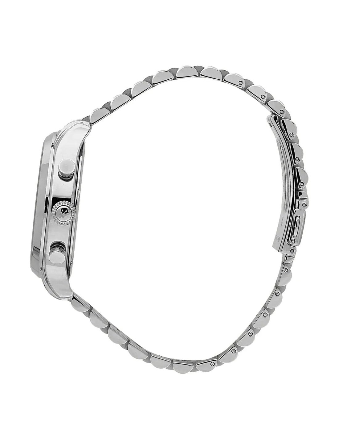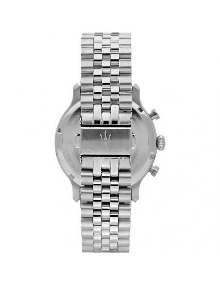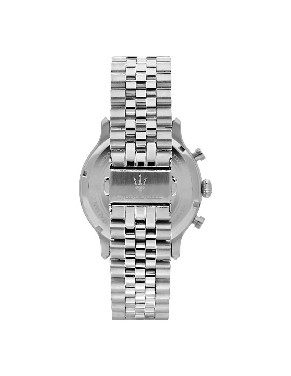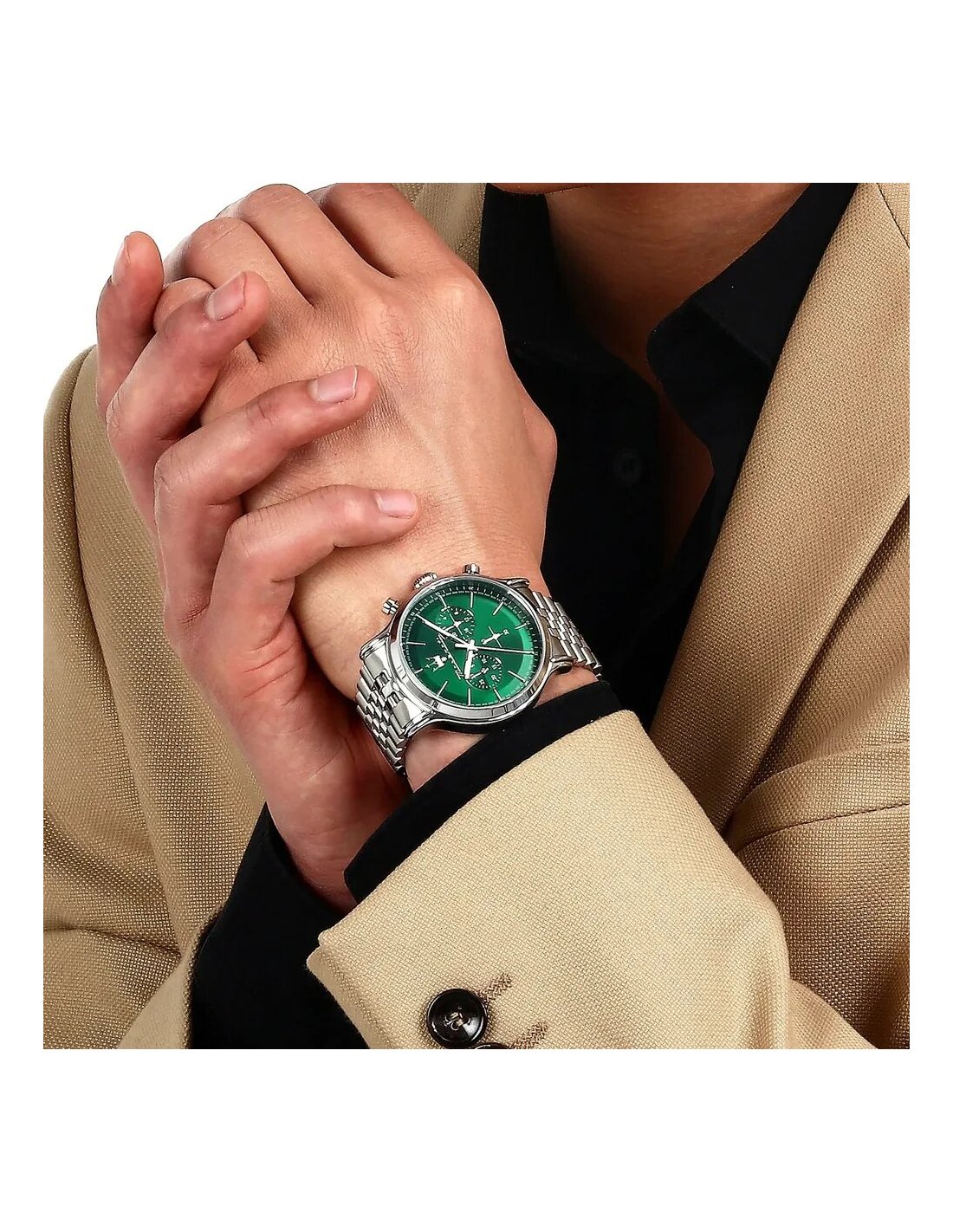 Reloj Maserati para hombre de la colección Epoca fabricado en acero inoxidable plateado y verde. Estamos ante un atractivo y elegante reloj compuesto por caja de 42mm de diámetro con bisel plateado que contiene esfera verde con indicadores en forma de barras y agujas plateadas luminiscentes movidas por mecanismo de cuarzo analógico con función de cronógrafo. Todo ello protegido por cristal mineral. Su brazalete lo forman eslabones plateados con cierre desplegable. Resistente al agua hasta 10 ATM.